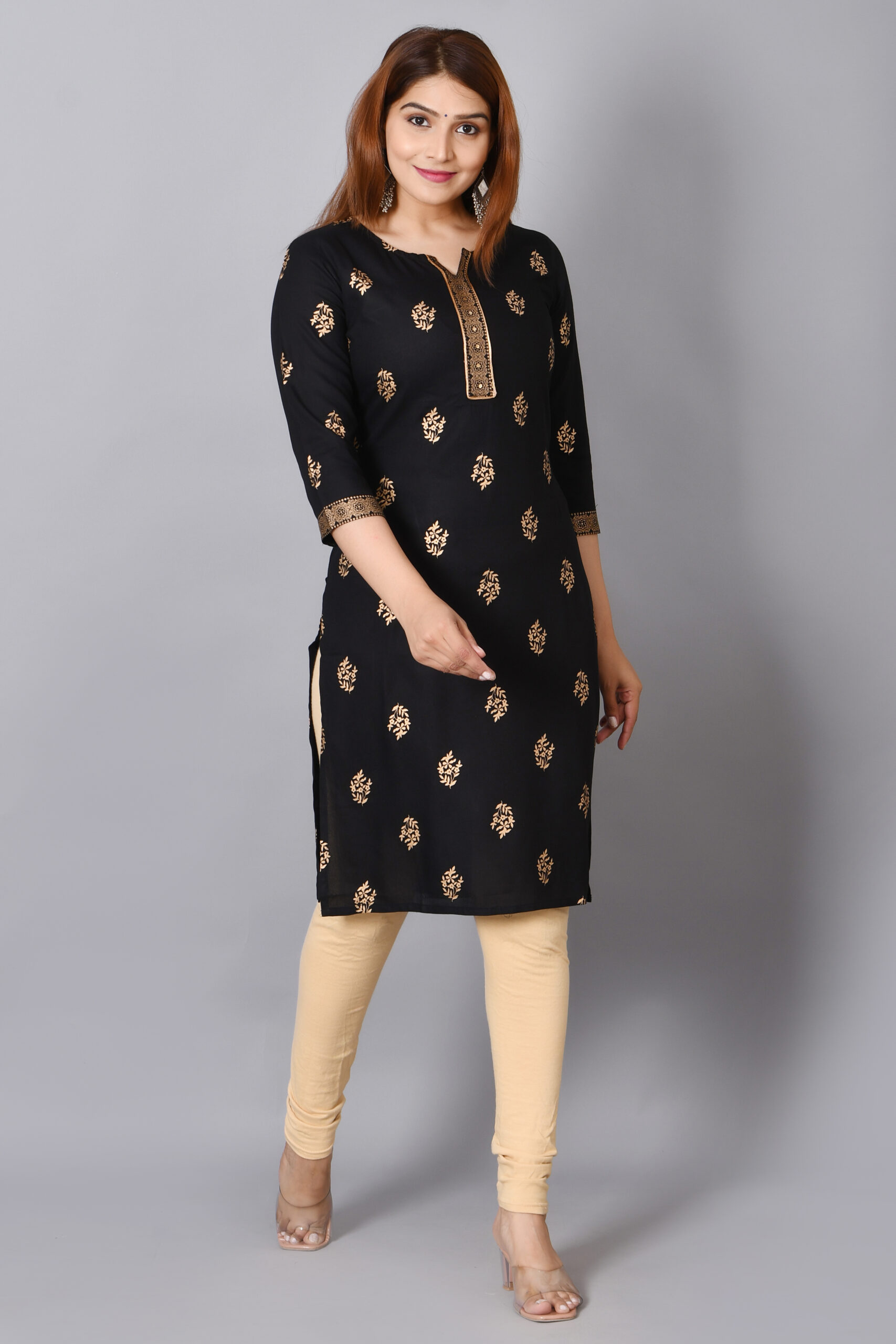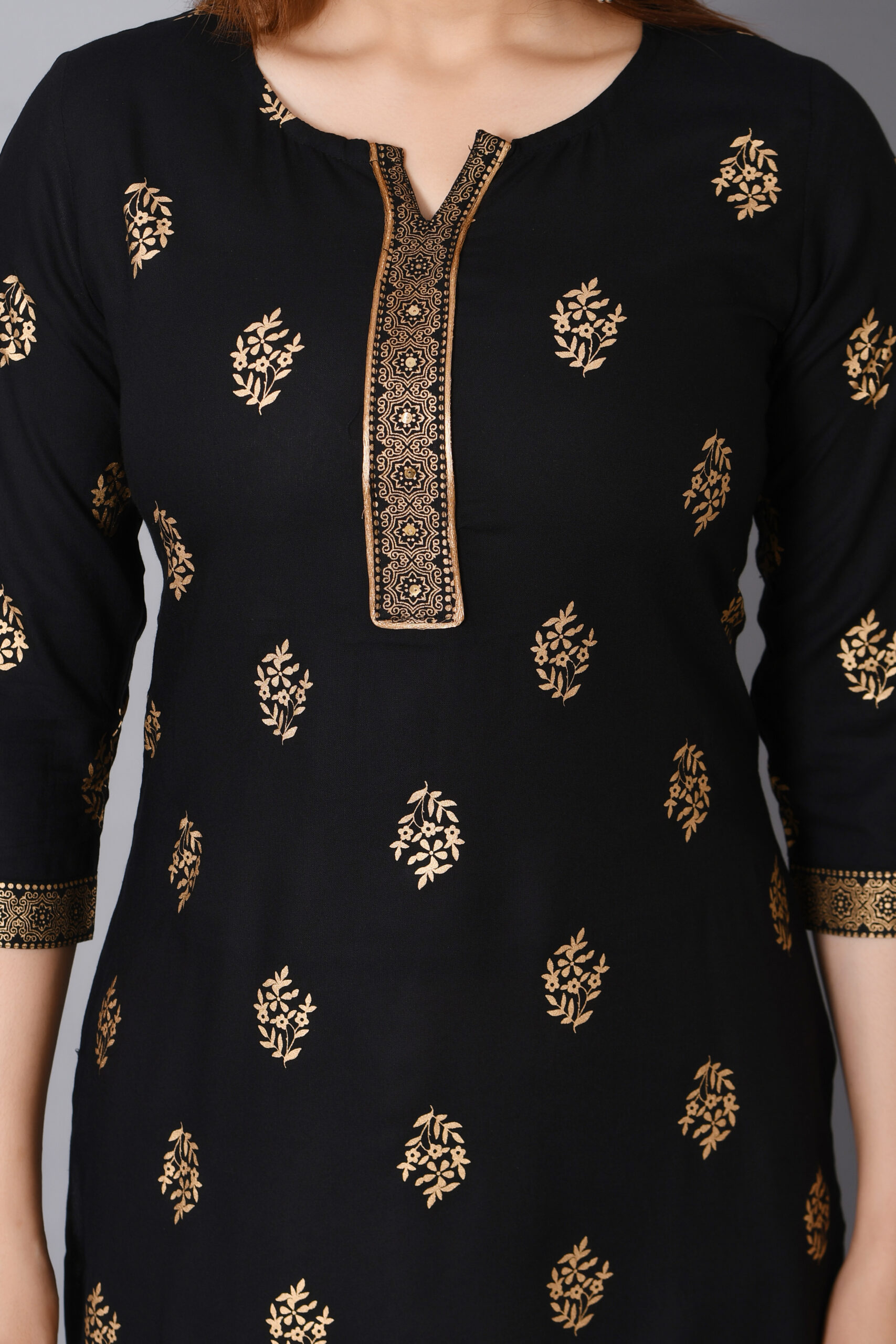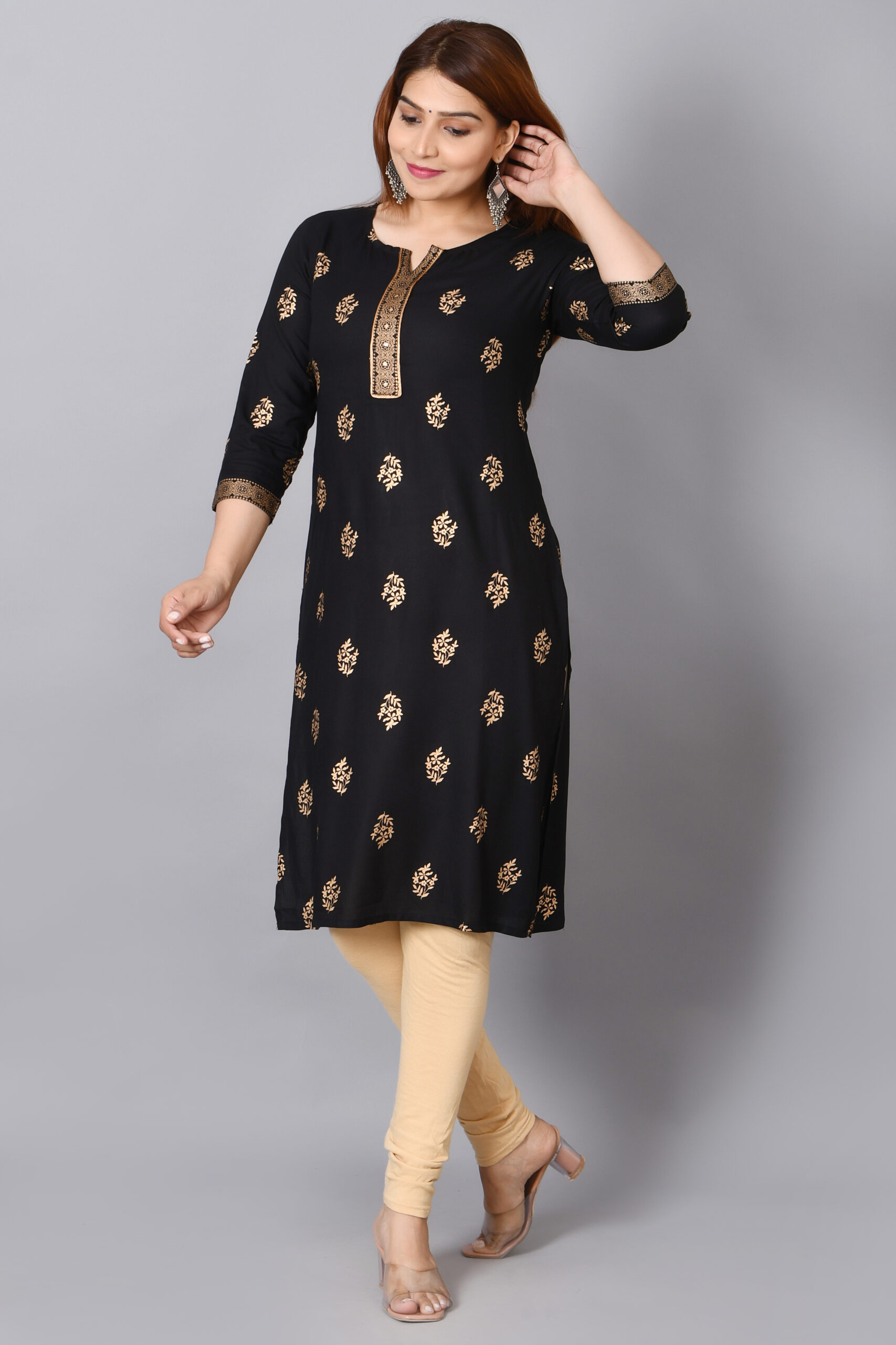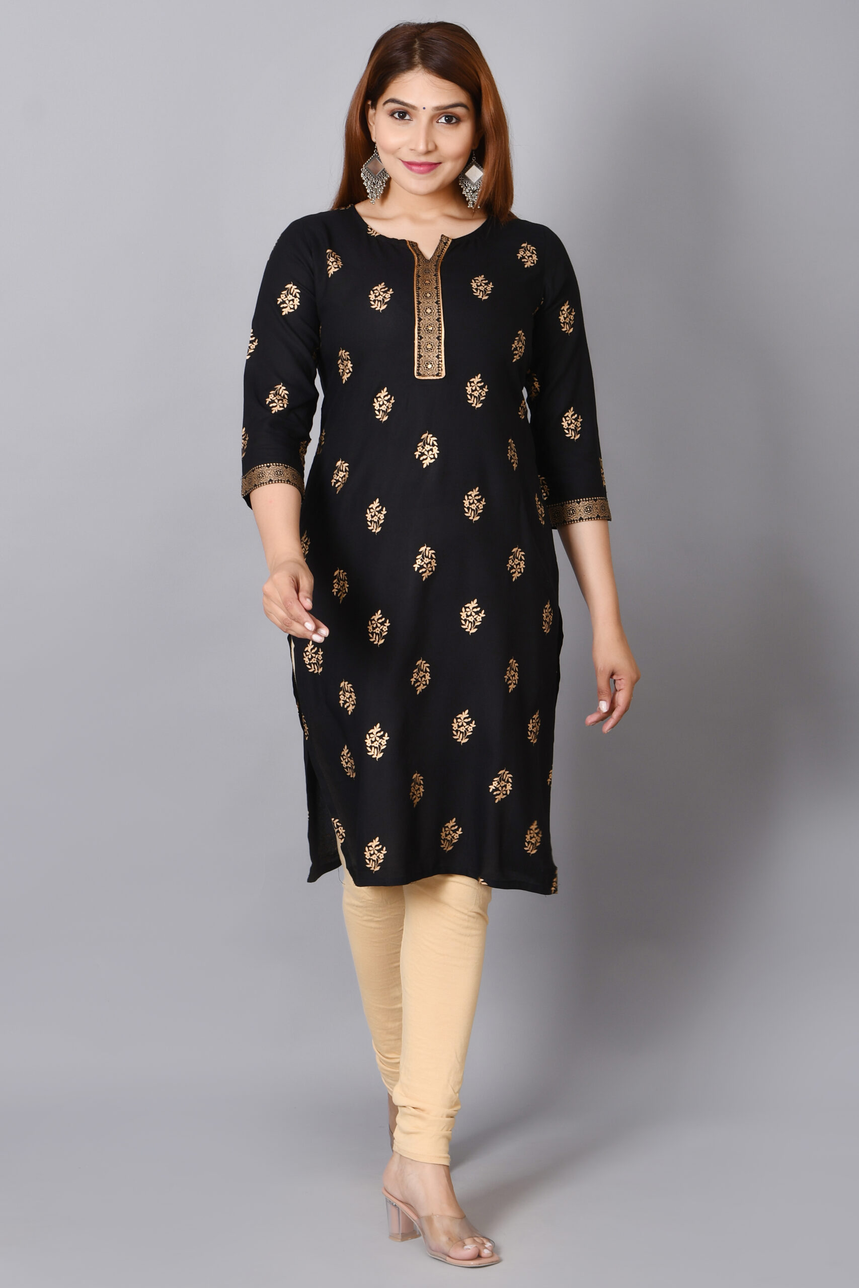 Cloth Bites Rayon Straight Kurta for Woman Foil Print Round Neck Kurti Knee Lenght Kurti with 3/4 Sleeves | Black