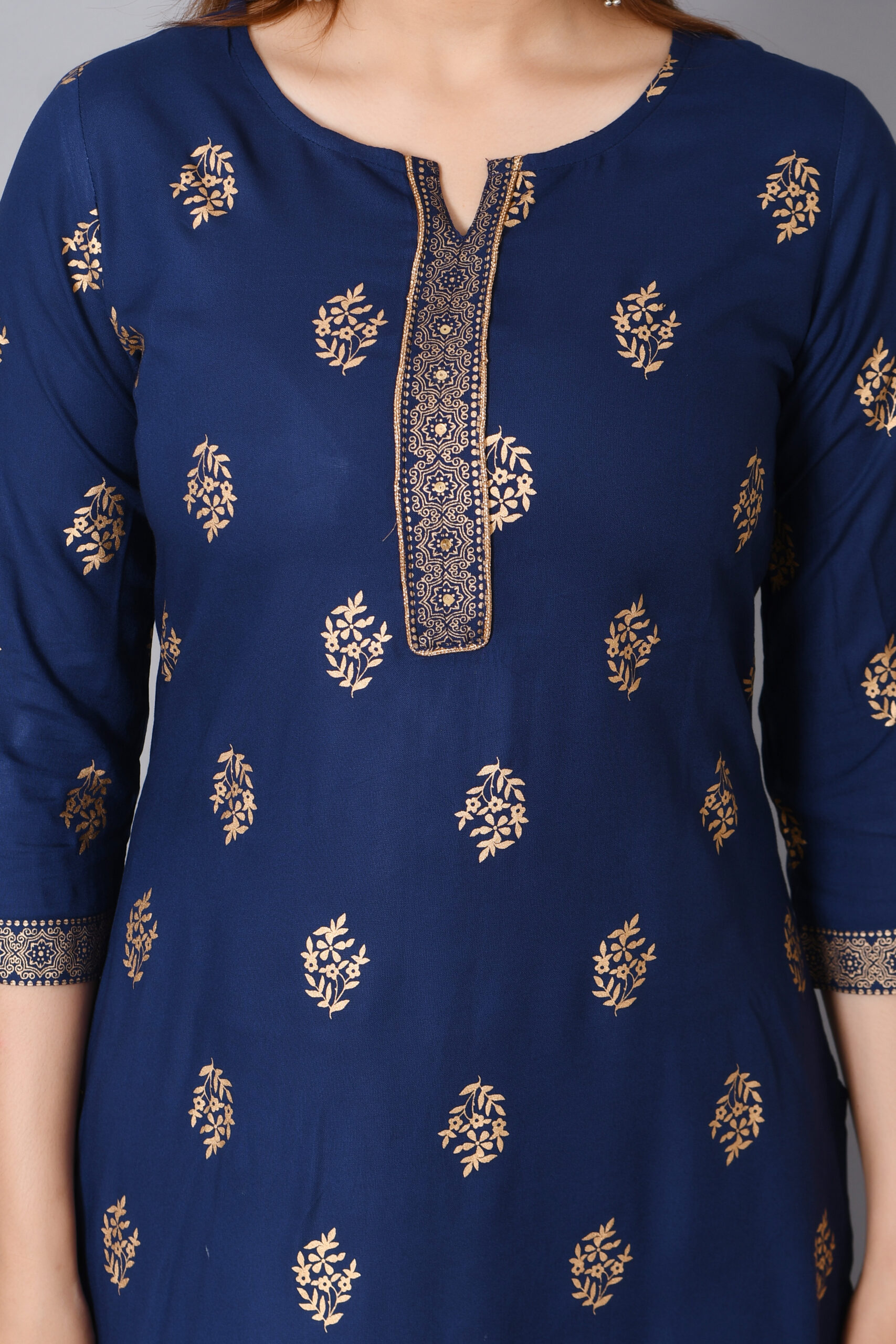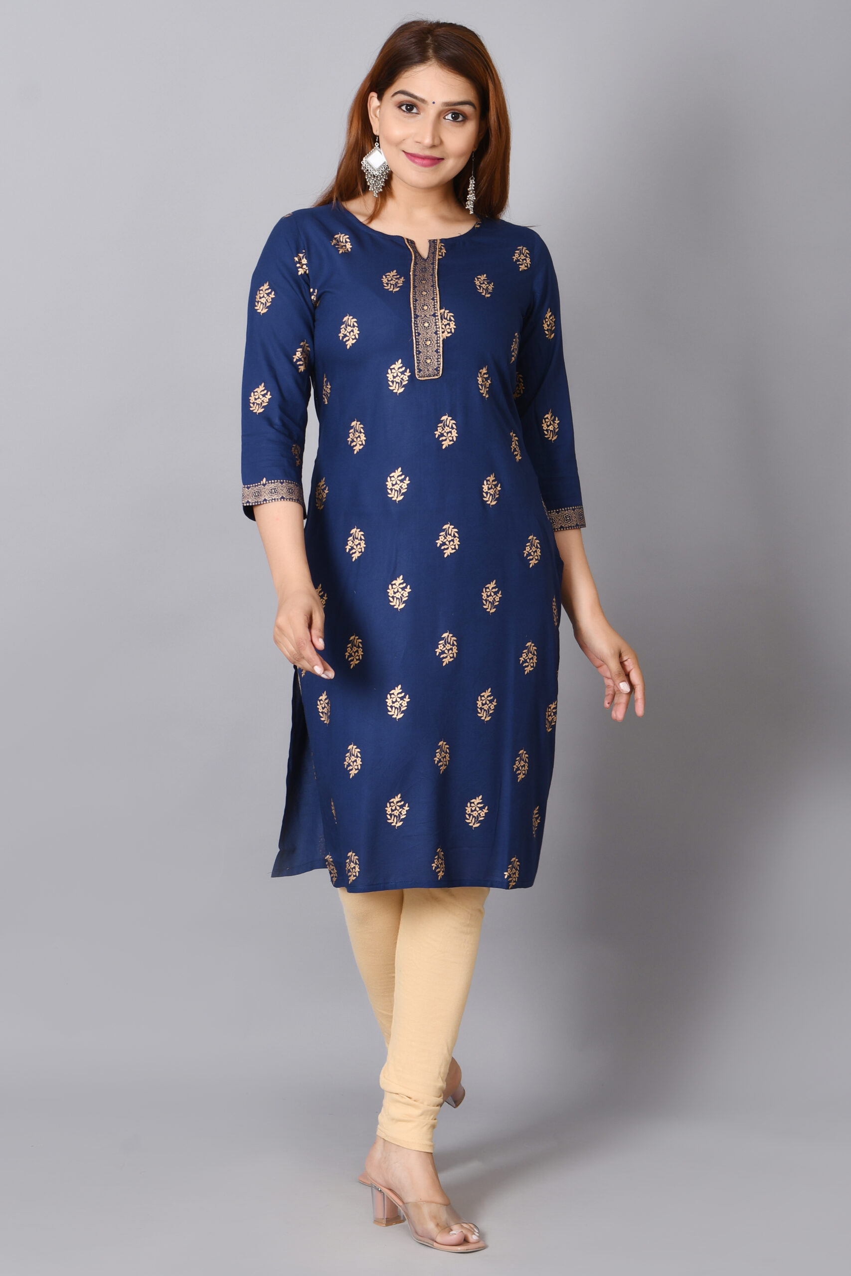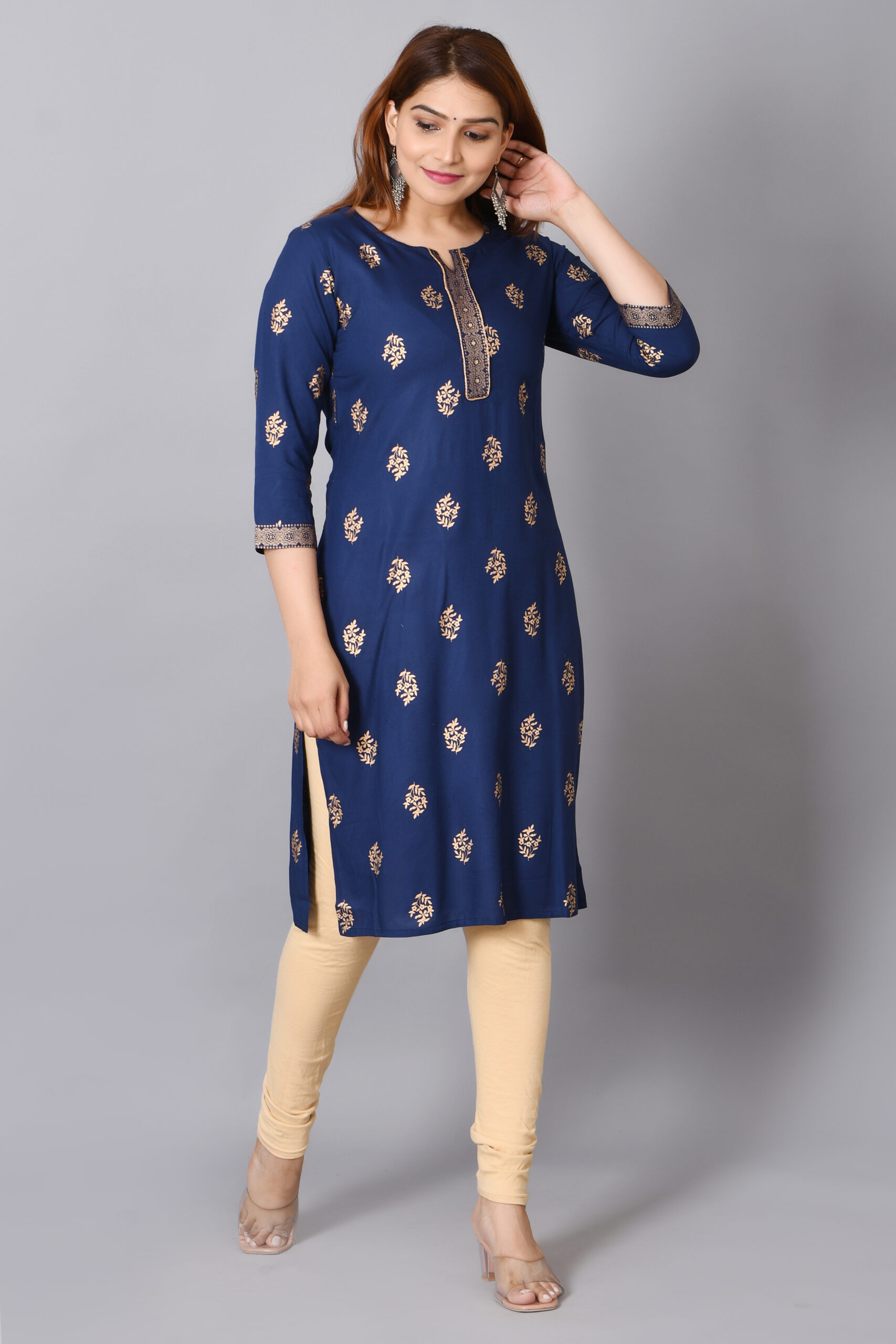 Cloth Bites Rayon Straight Kurta for Woman Foil Print Round Neck Kurti Knee Lenght Kurti with 3/4 Sleeves | Blue