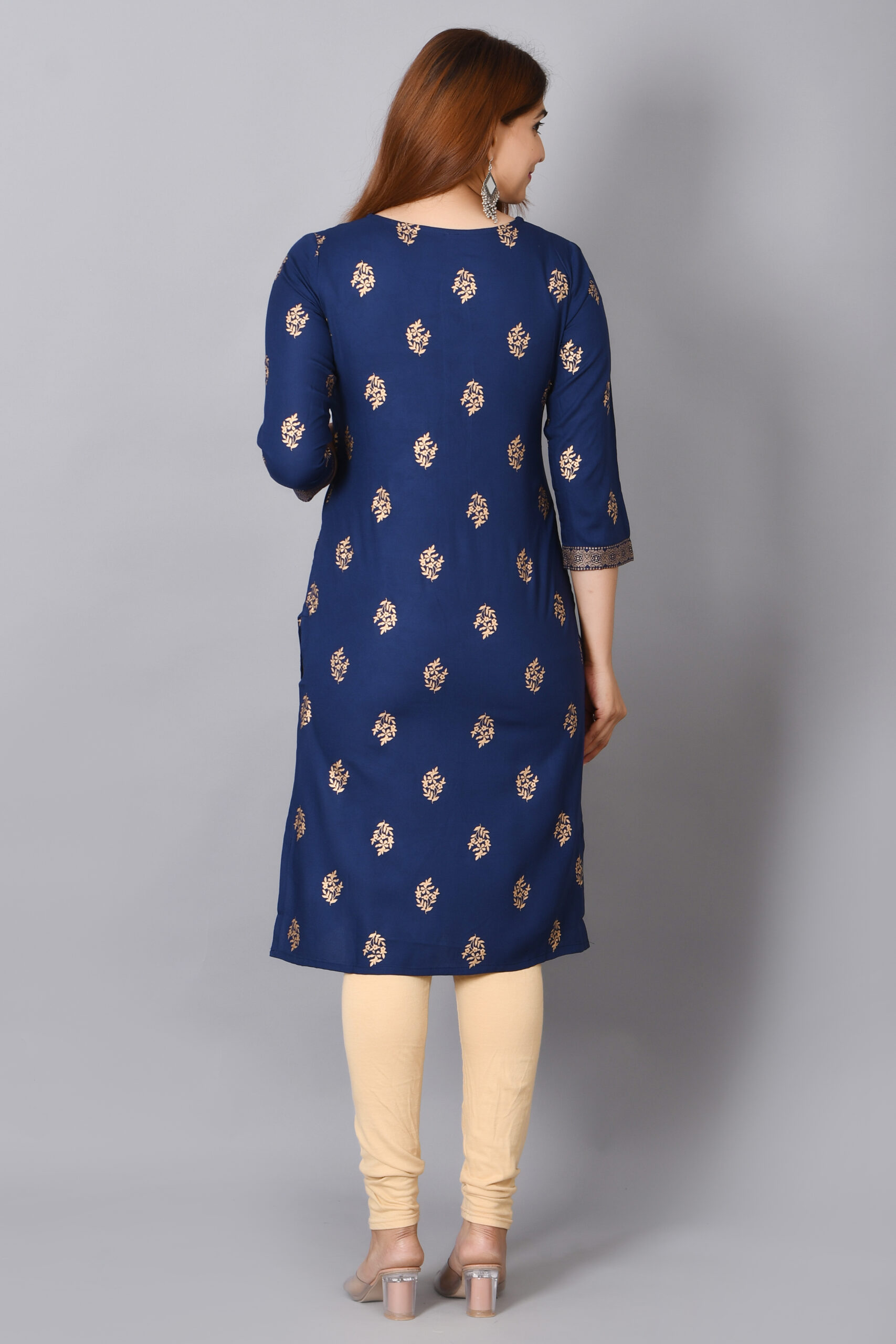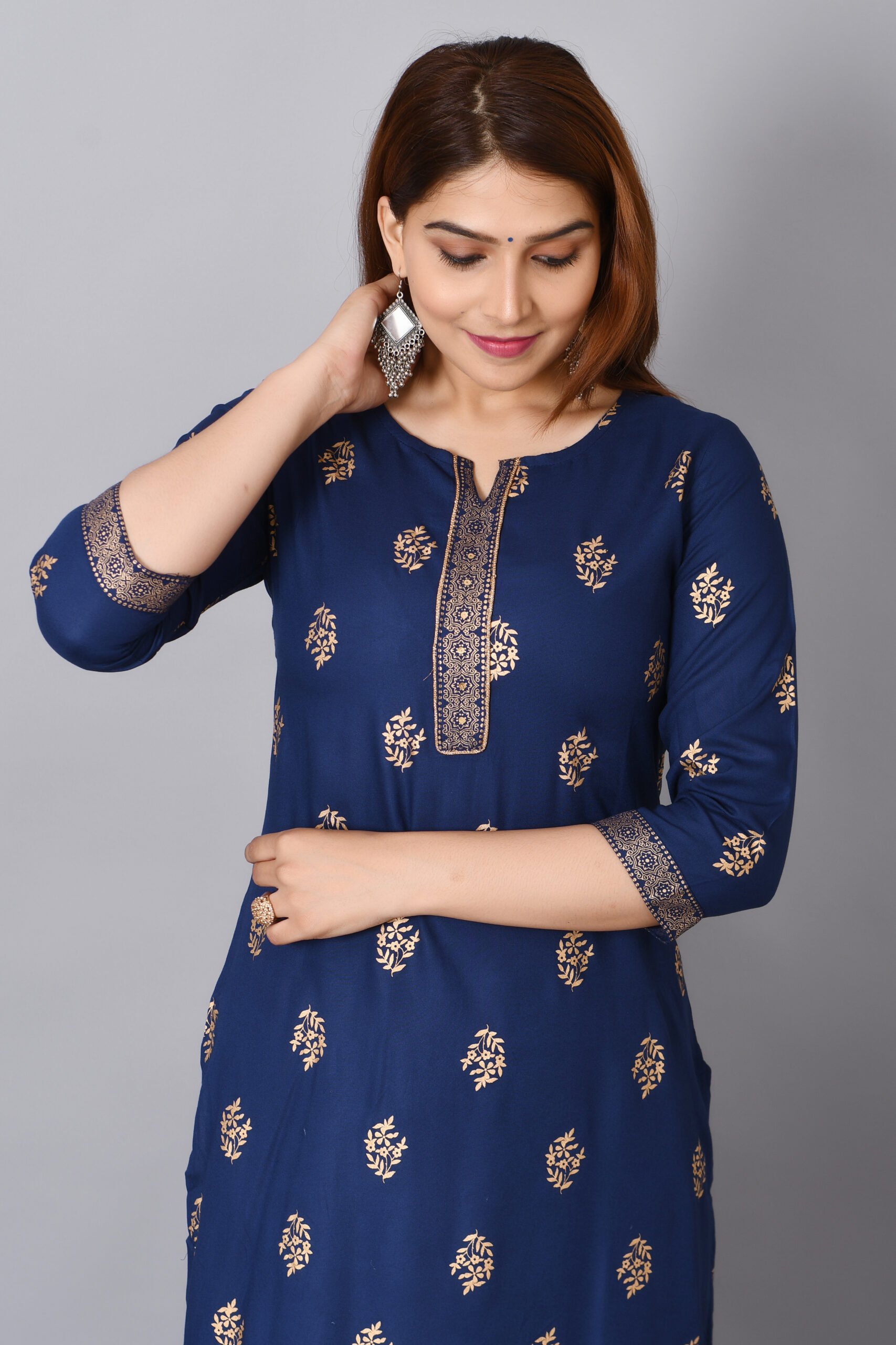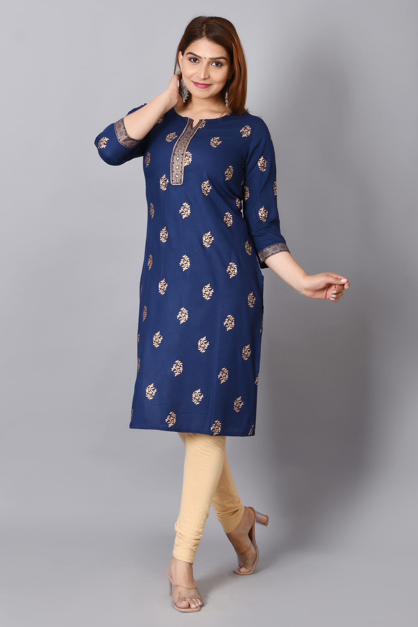 Cloth Bites Rayon Straight Kurta for Woman Foil Print Round Neck Kurti Knee Lenght Kurti with 3/4 Sleeves | Blue