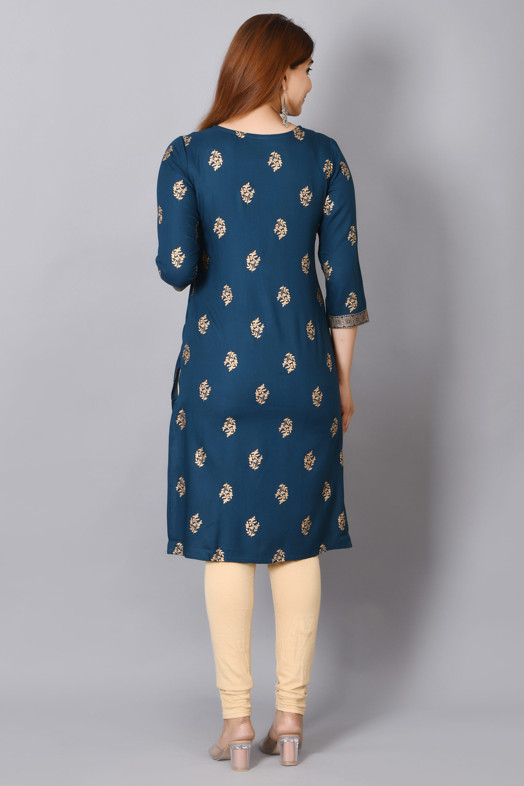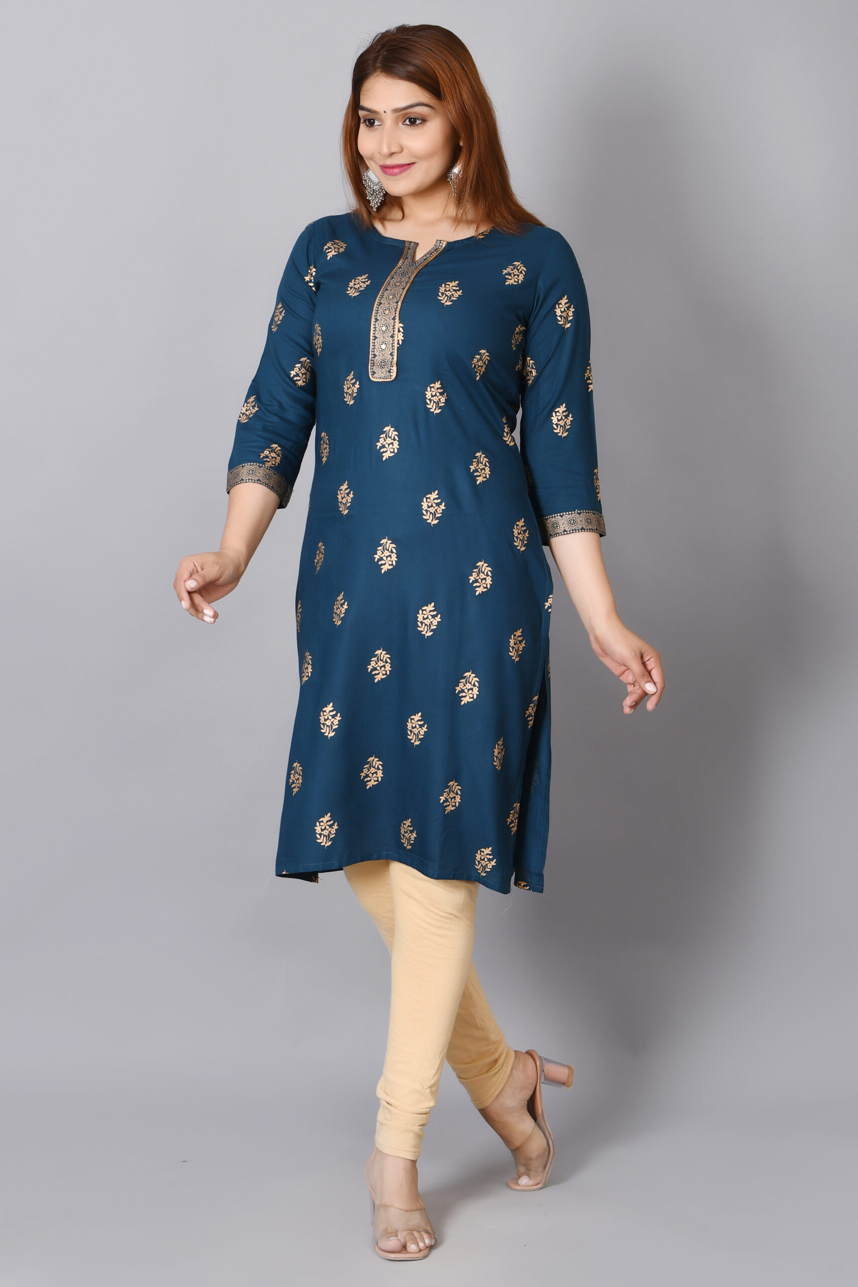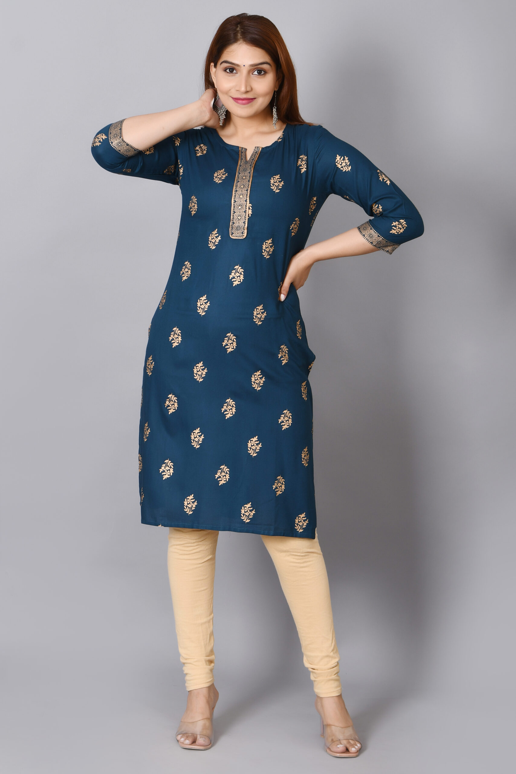 Cloth Bites Rayon Straight Kurta for Woman Foil Print Round Neck Kurti Knee Lenght Kurti with 3/4 Sleeves | Teal Blue