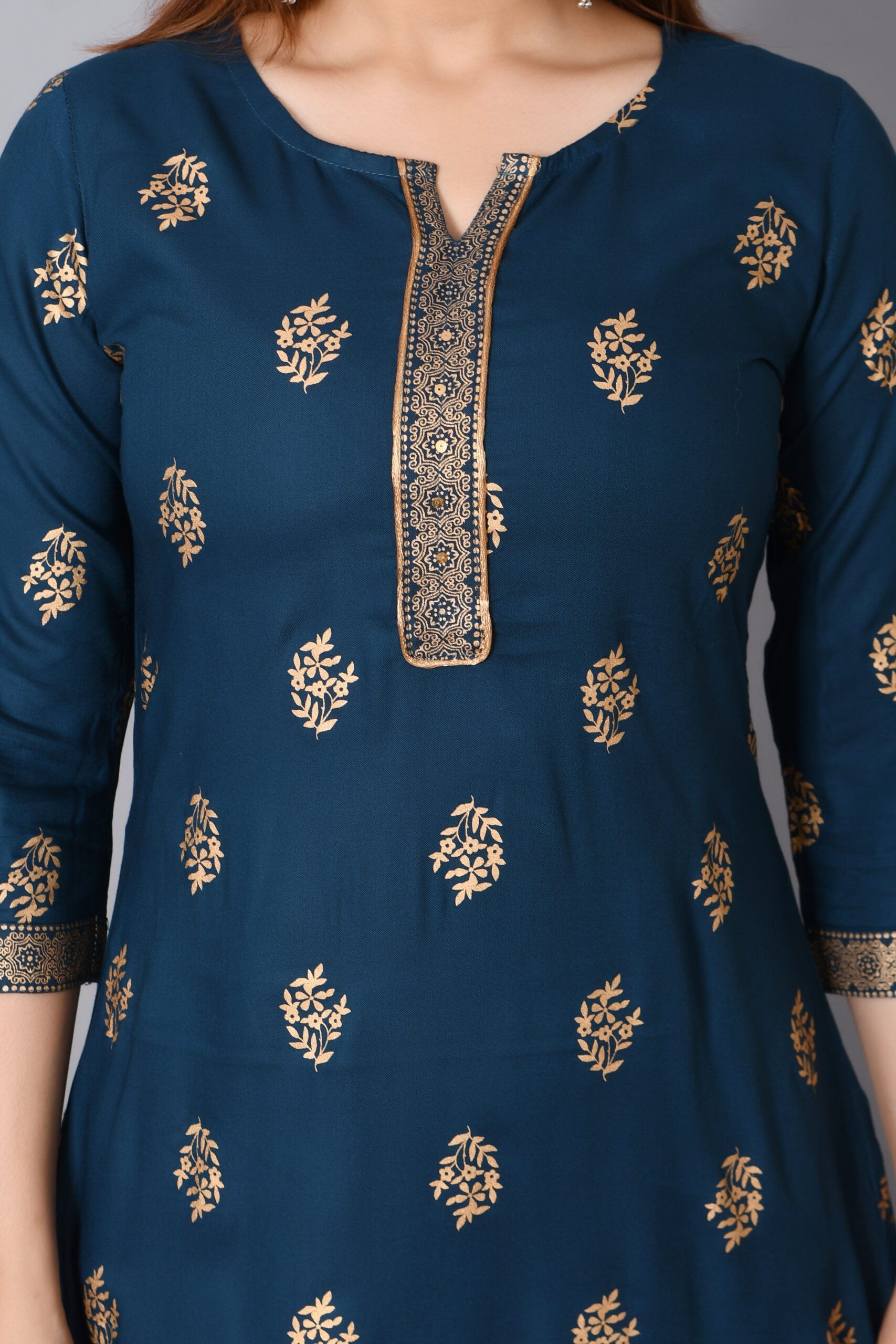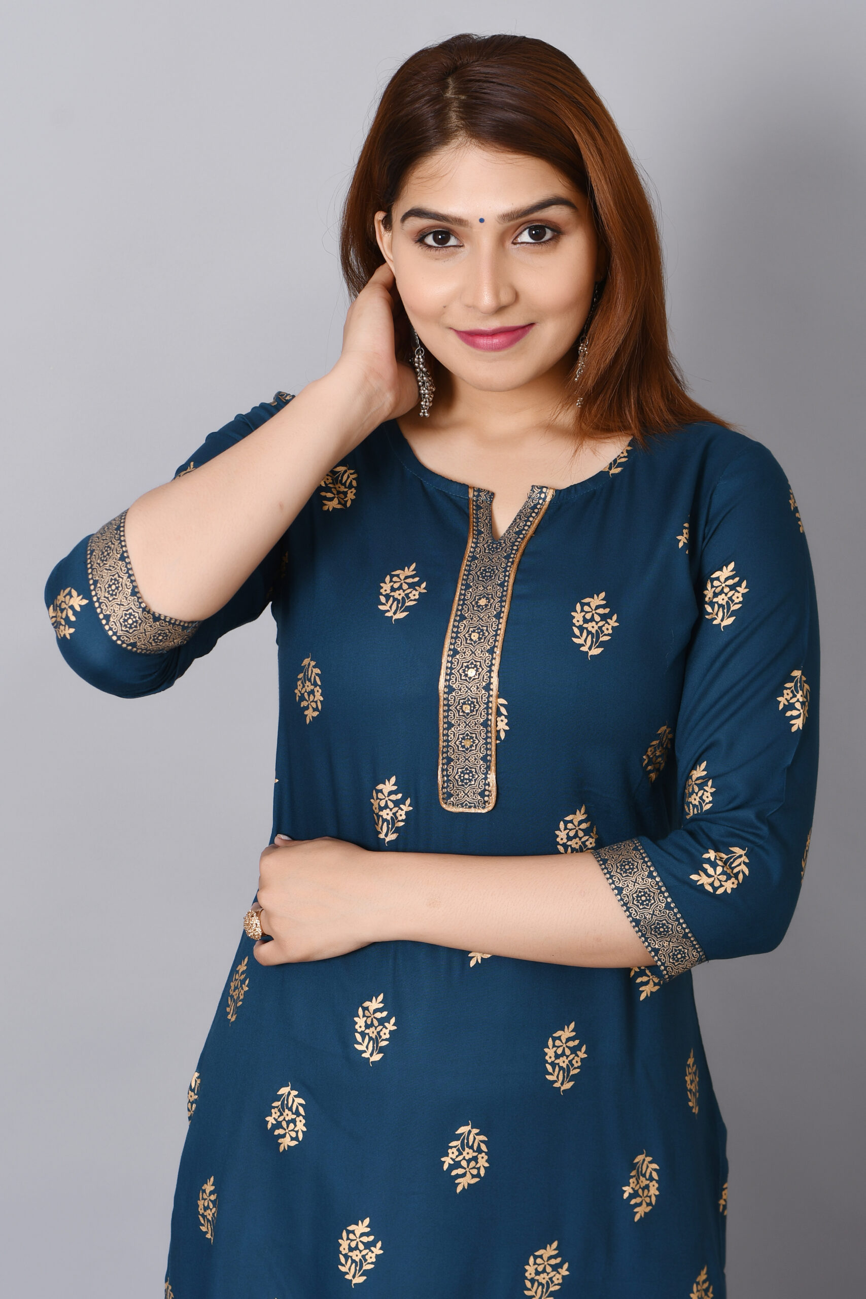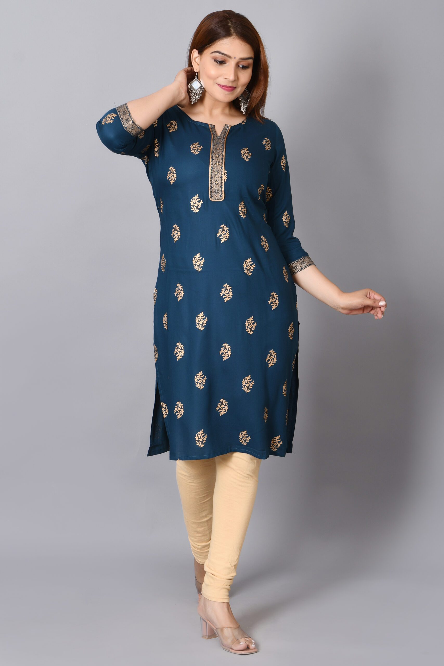 Cloth Bites Rayon Straight Kurta for Woman Foil Print Round Neck Kurti Knee Lenght Kurti with 3/4 Sleeves | Teal Blue