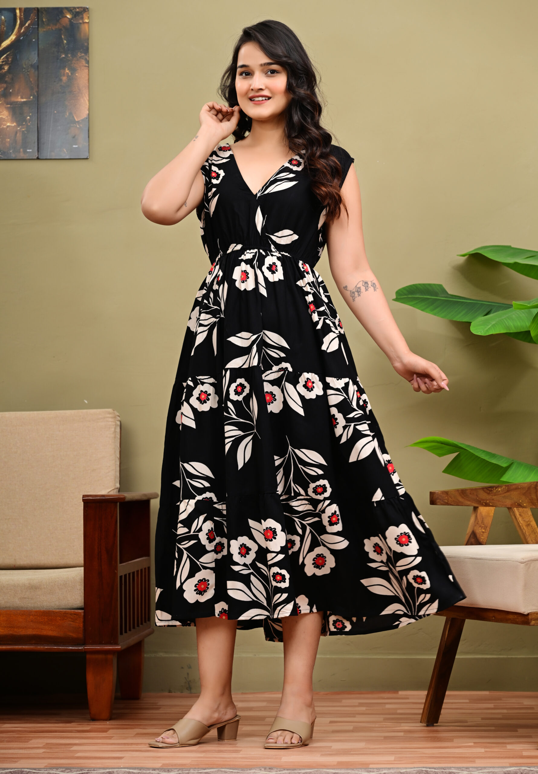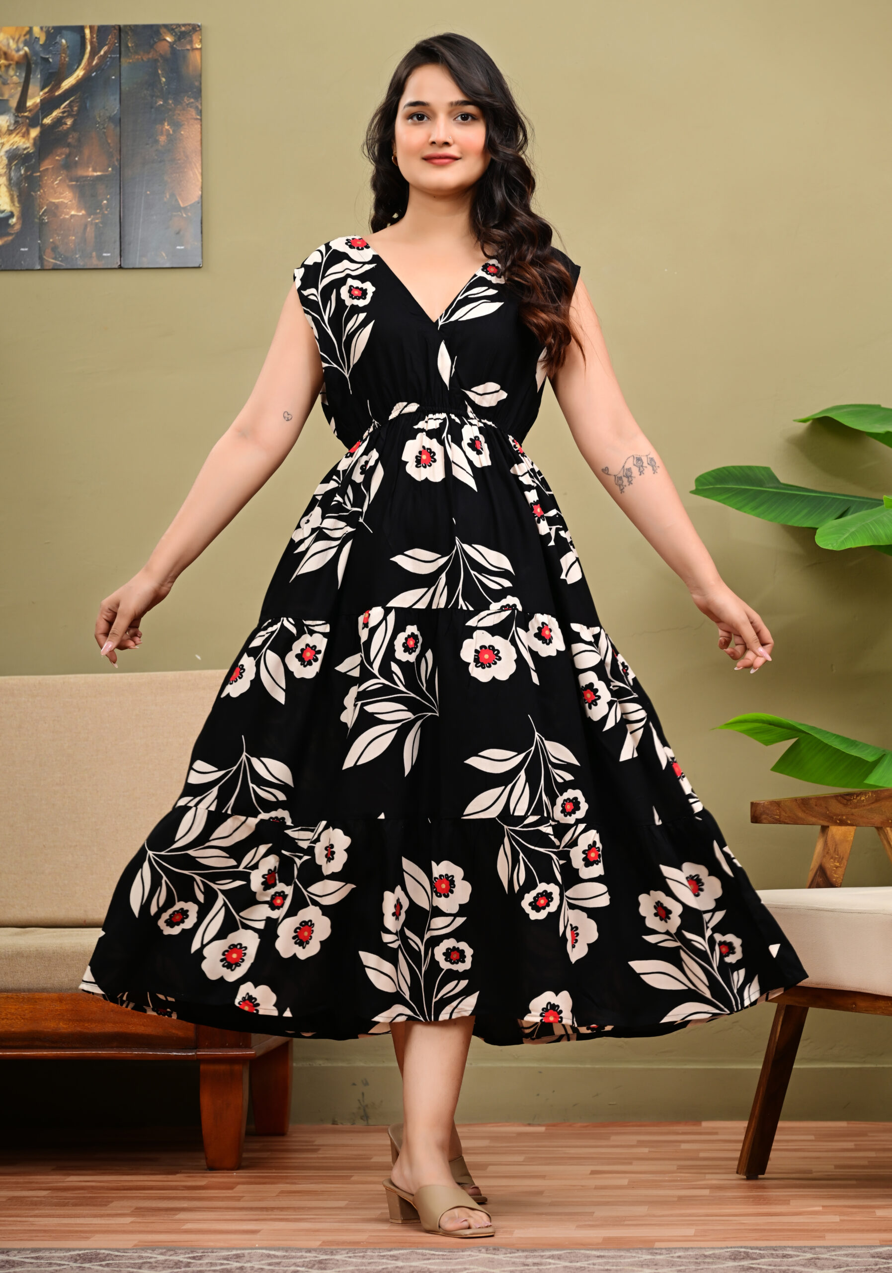 Bring timeless grace to your wardrobe with this sleeveless round neck rayon printed anarkali kurtis for women — a blend of comfort, charm, and effortless style. Crafted from premium rayon fabric, this long Anarkali kurti features a flowing silhouette that flatters every body type.