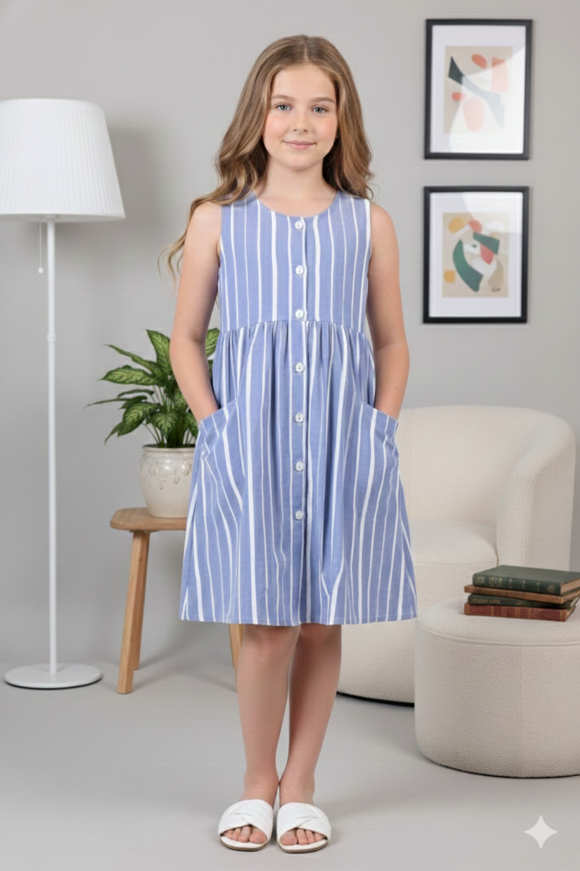 Kids Cotton Long Frocks for Kids Girls | Light Blue Stripes