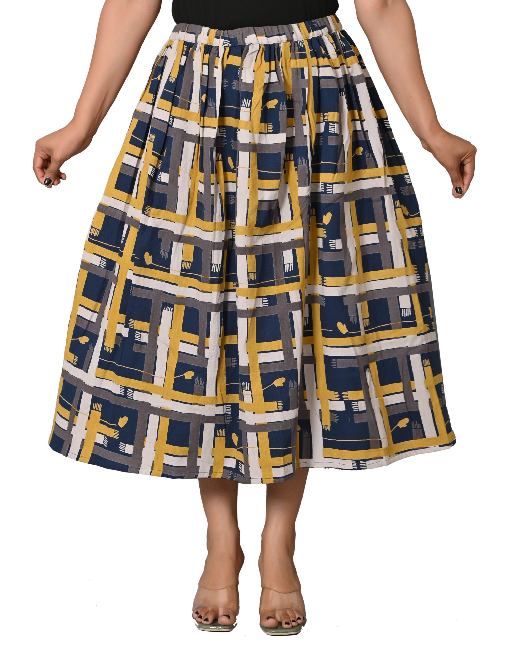 Free Size Printed Cotton Midi Flared Long Skirts for Women | Brush-Stroke Grid