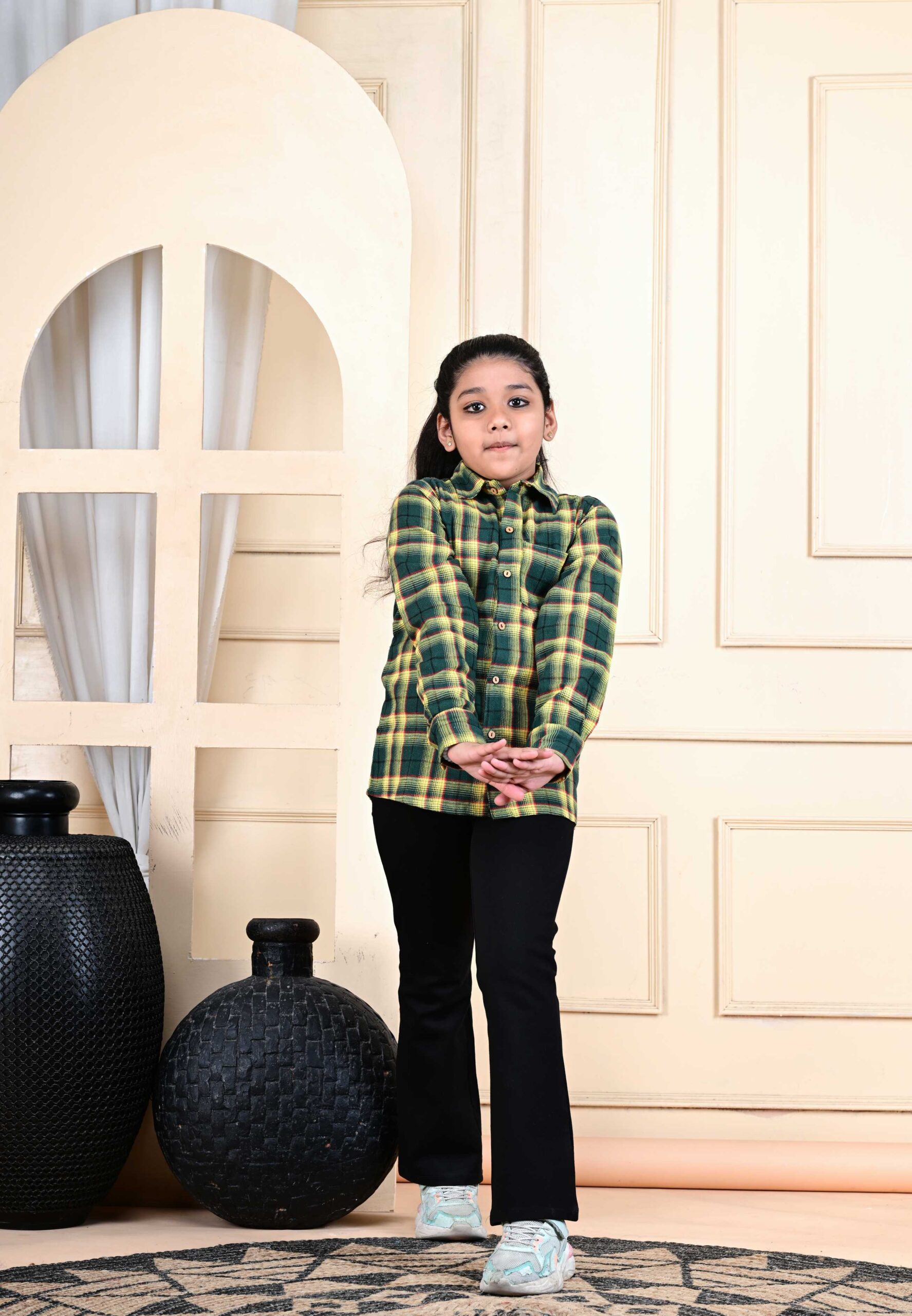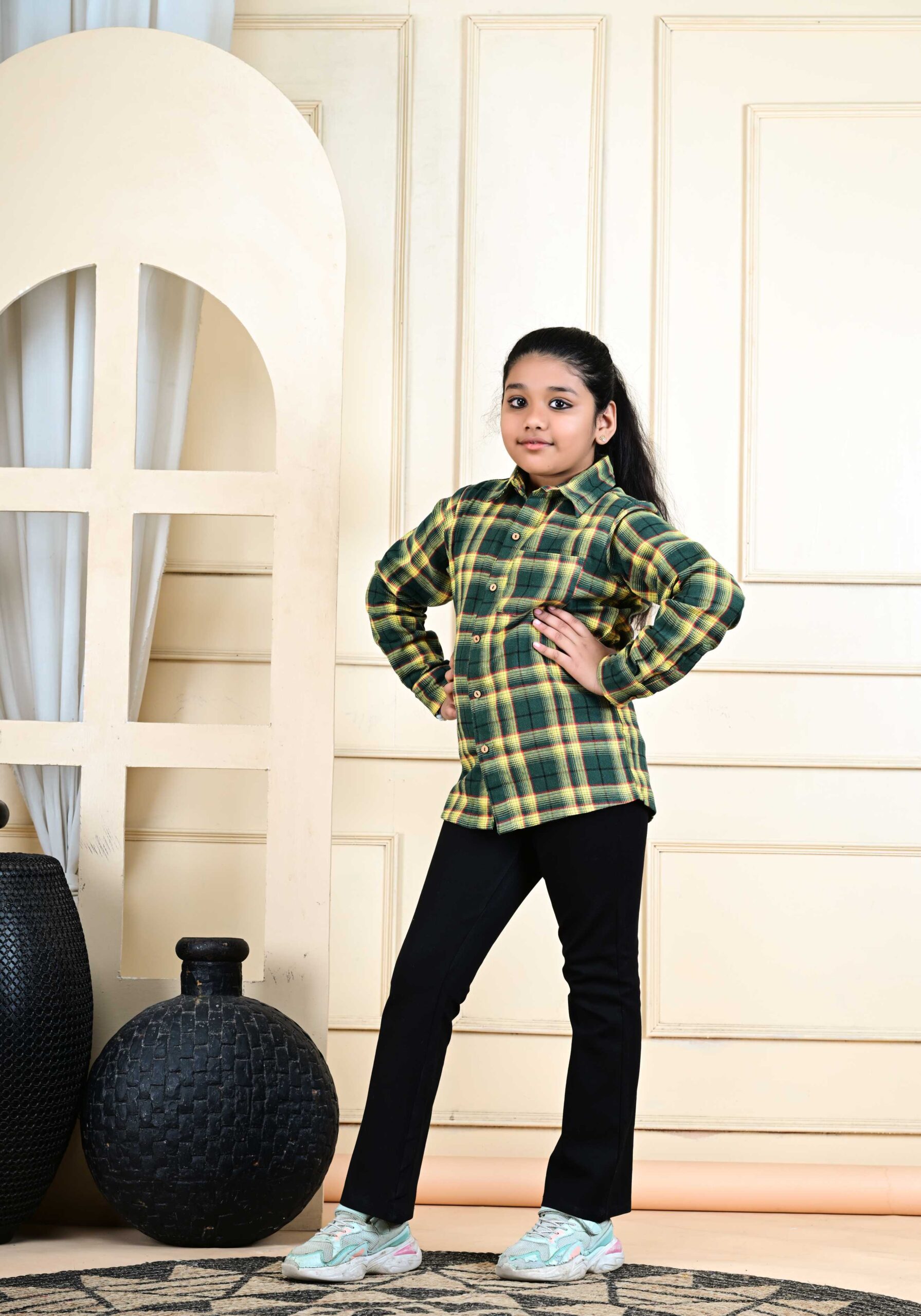 The smart checked pattern gives it a classic, stylish look that never goes out of fashion. Whether she’s heading to school, a family outing, or a casual get-together, this shirt keeps her looking neat and confident.