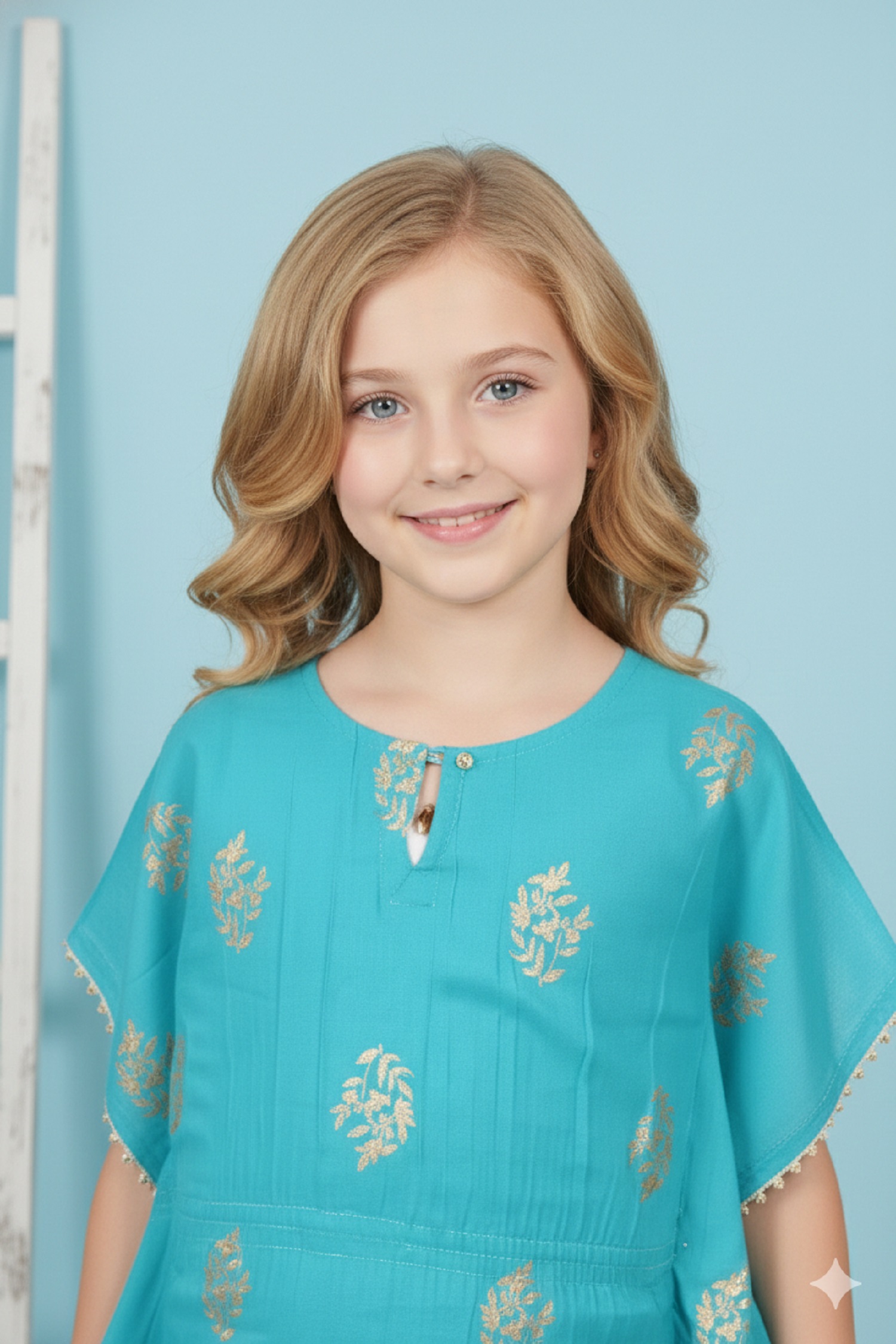 Printed Kaftan Kurti Kids Dress for Girls – Rayon Turquoise
