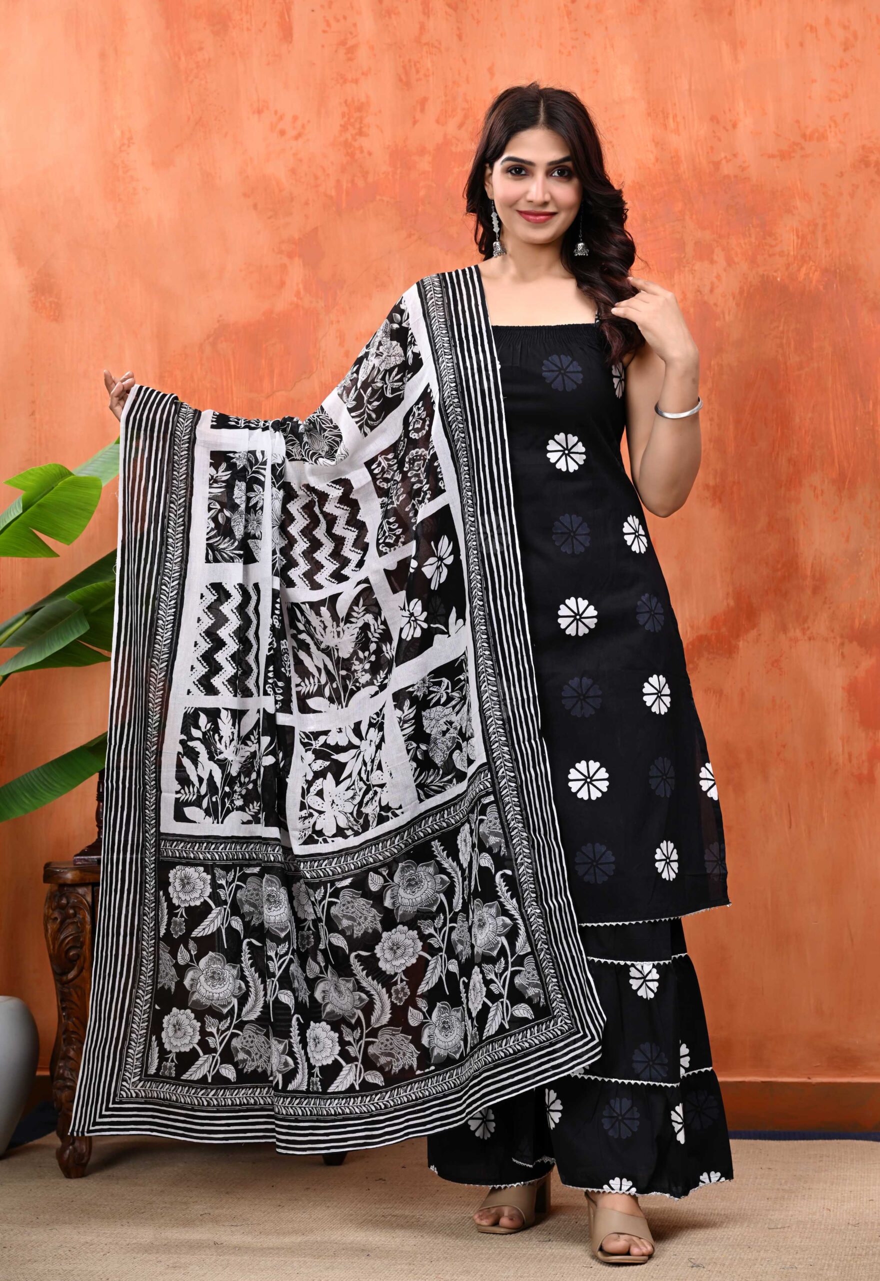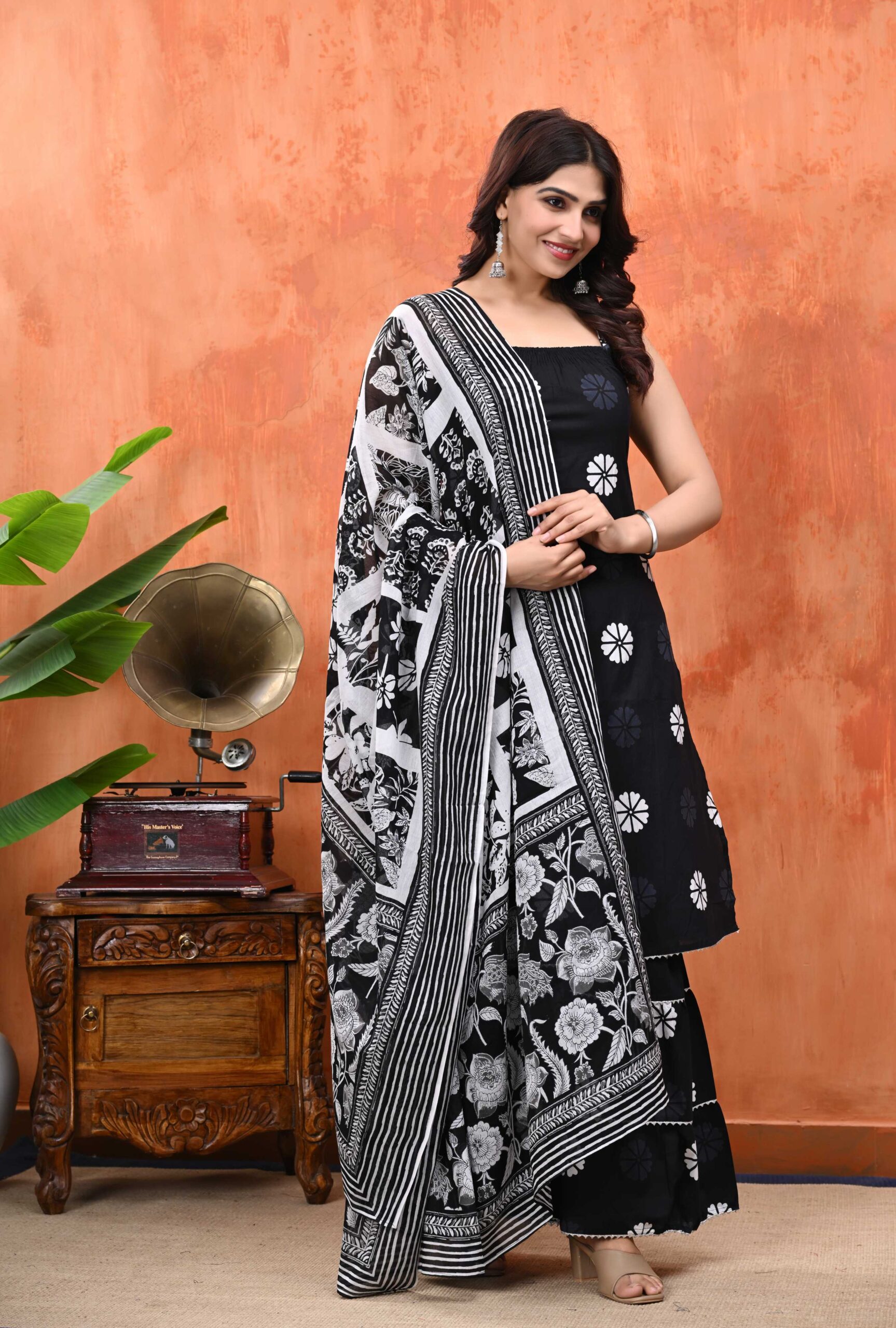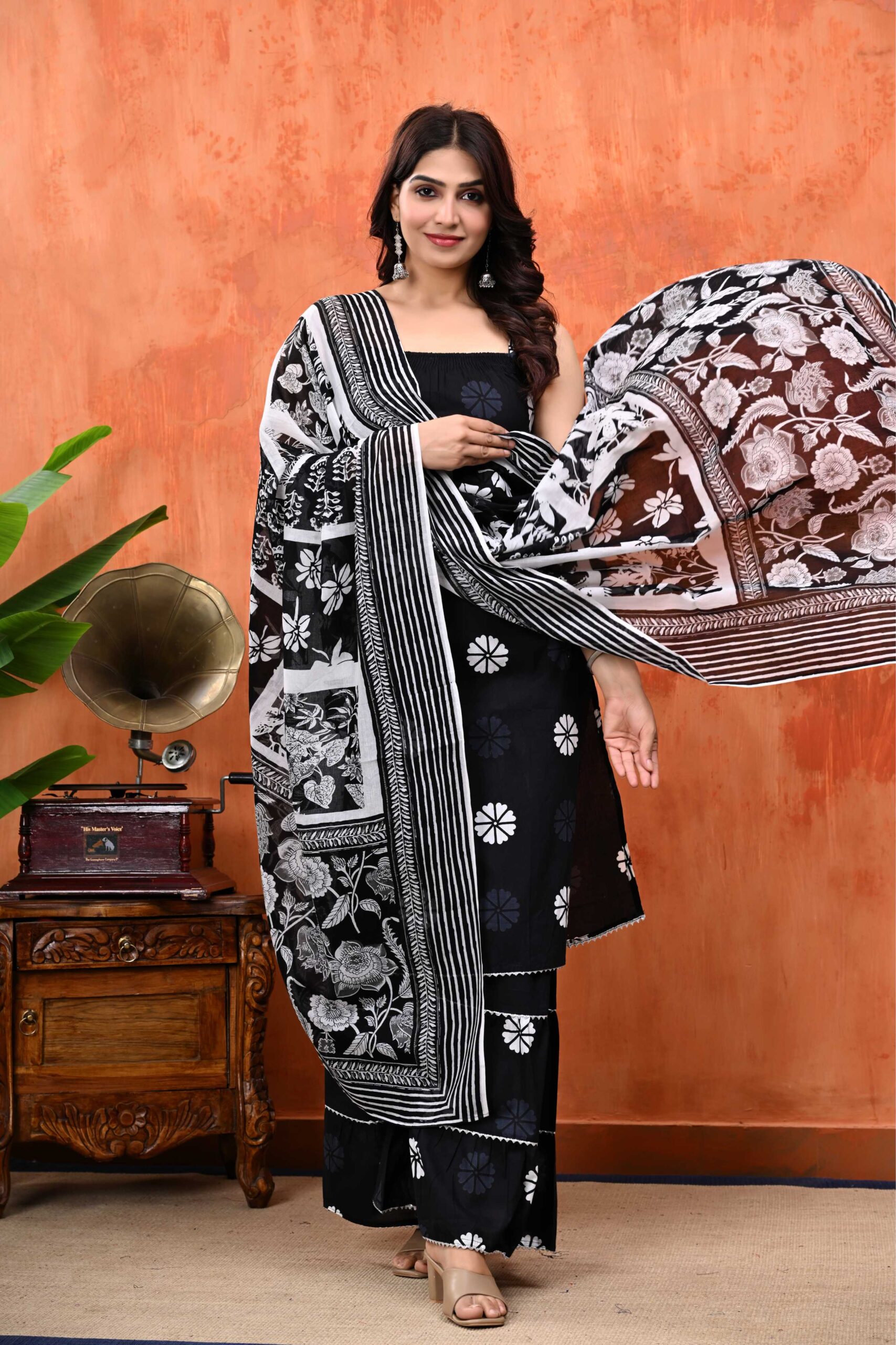 Step into effortless elegance with this beautiful Anarkali kurta set for women, designed to blend traditional charm with modern comfort. Crafted from pure cotton fabric, the set includes a floral printed kurta, matching printed sharara, and a coordinating dupatta — making it a complete ethnic outfit for festive and casual occasions alike.