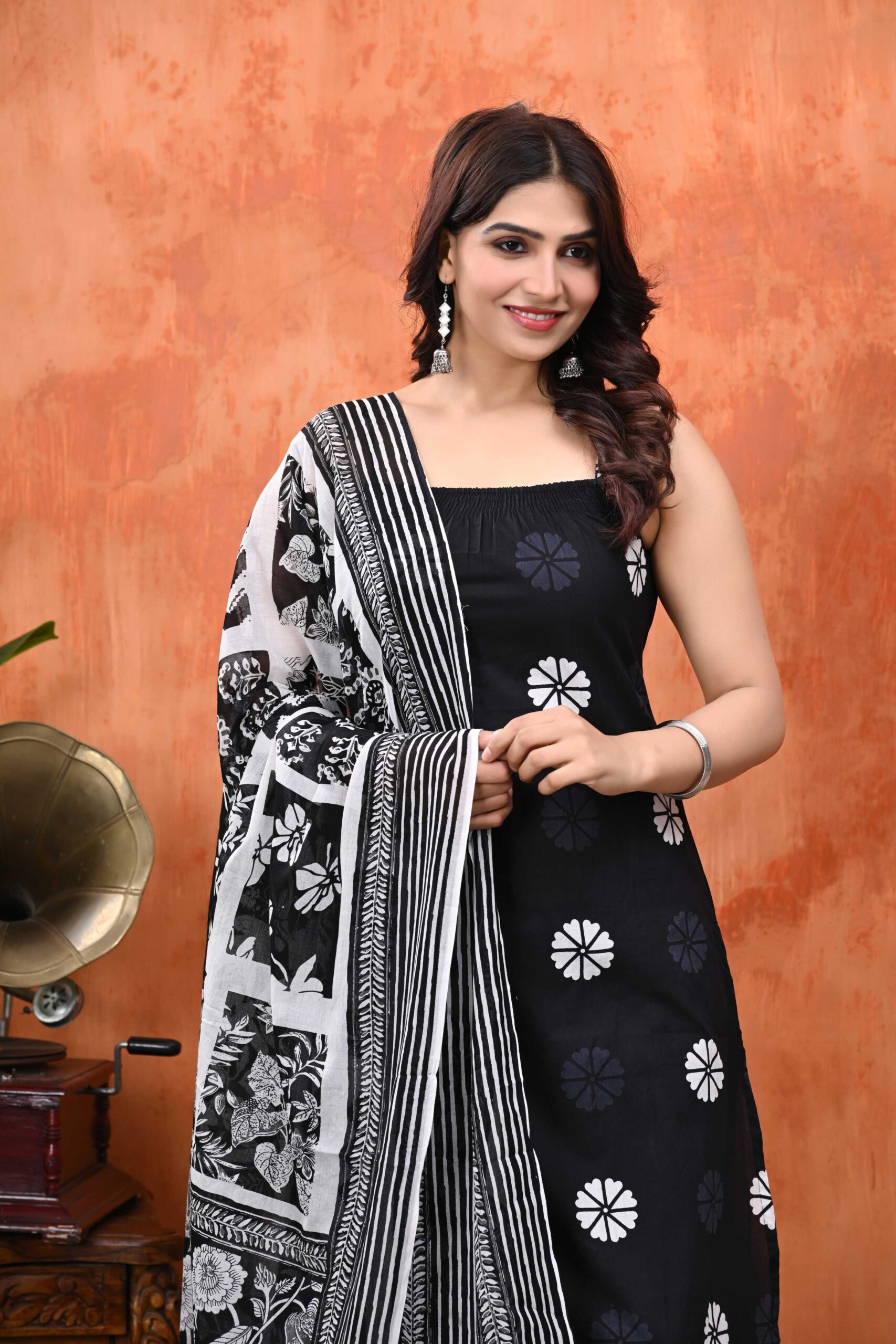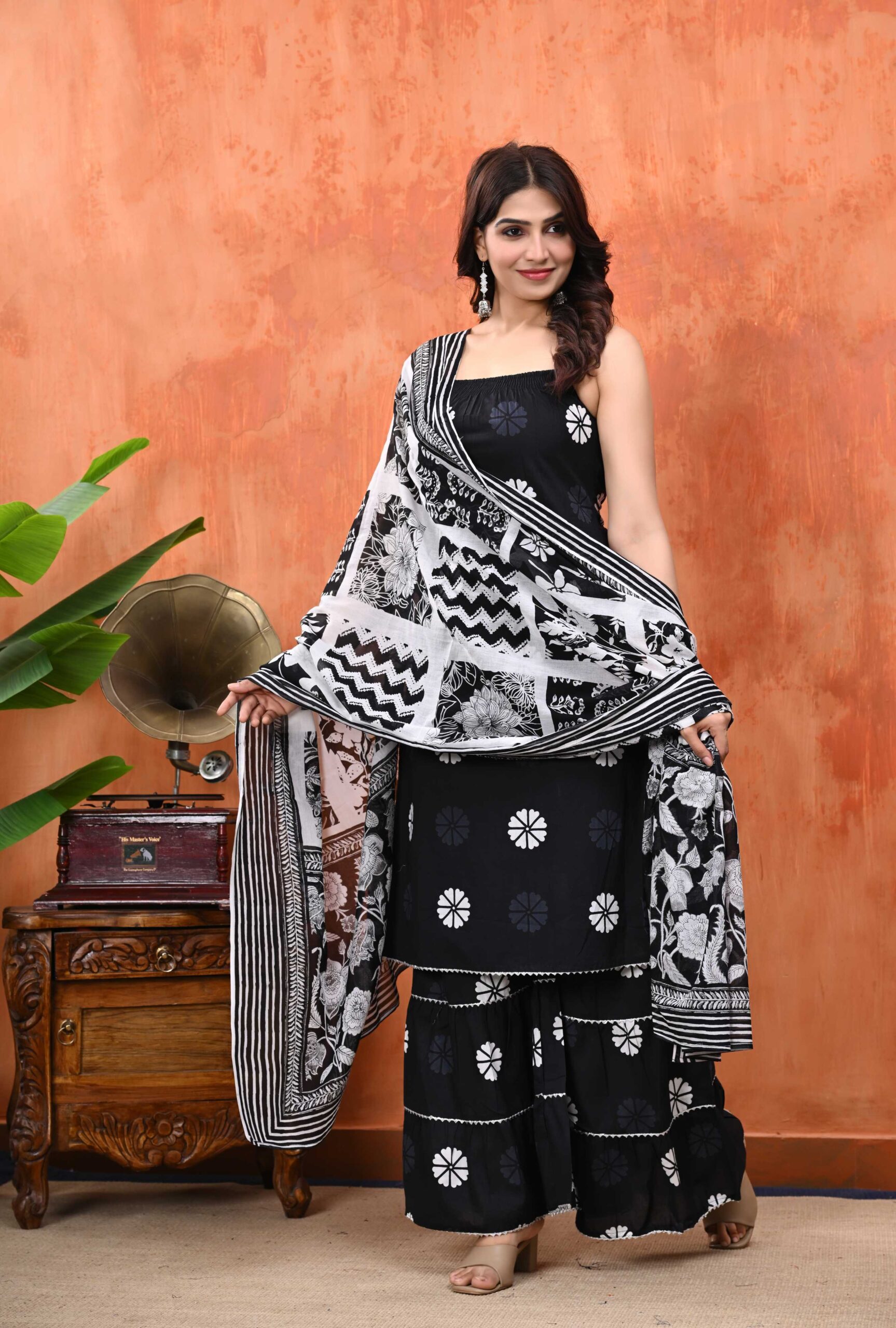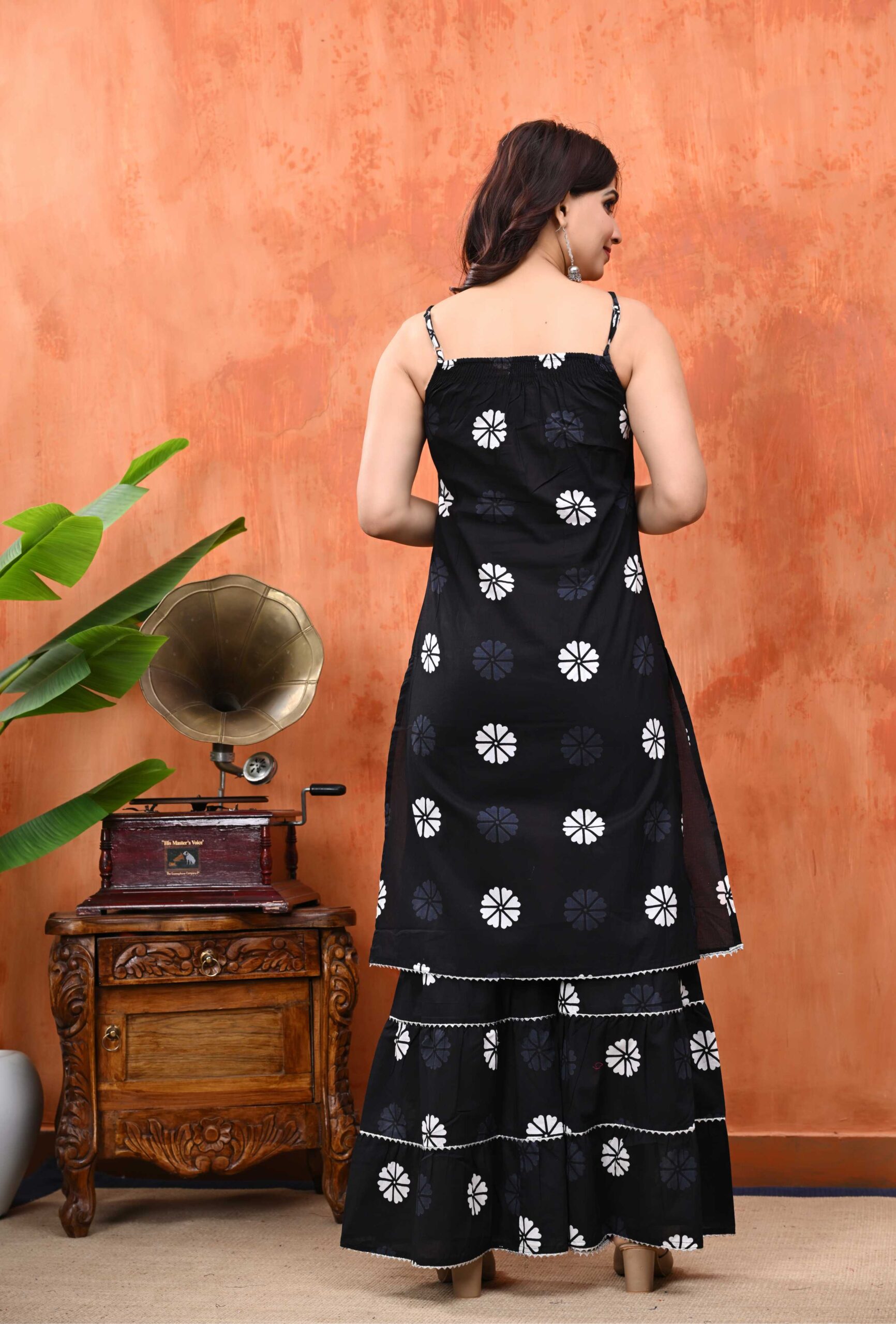 Step into effortless elegance with this beautiful Anarkali kurta set for women, designed to blend traditional charm with modern comfort. Crafted from pure cotton fabric, the set includes a floral printed kurta, matching printed sharara, and a coordinating dupatta — making it a complete ethnic outfit for festive and casual occasions alike.
