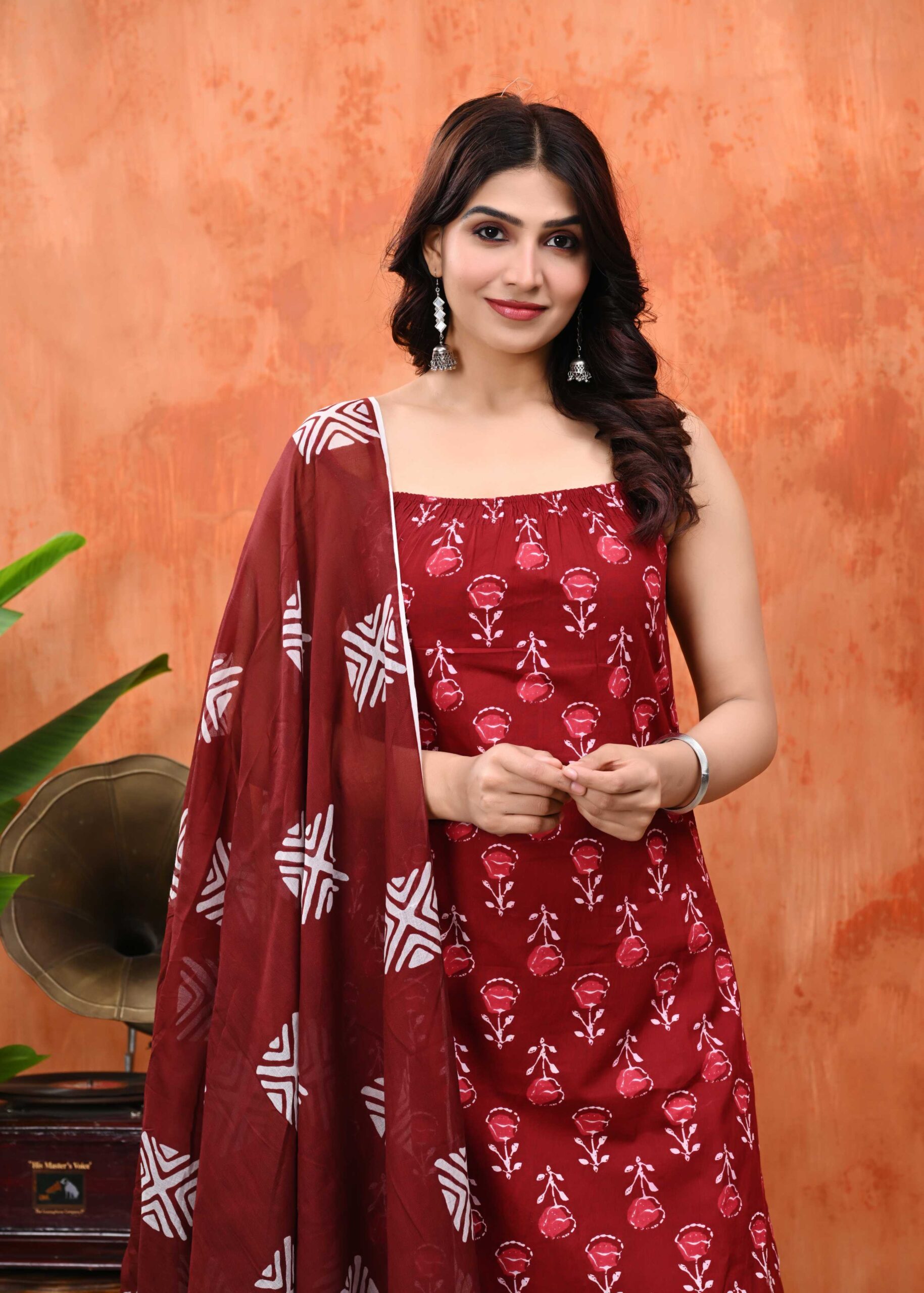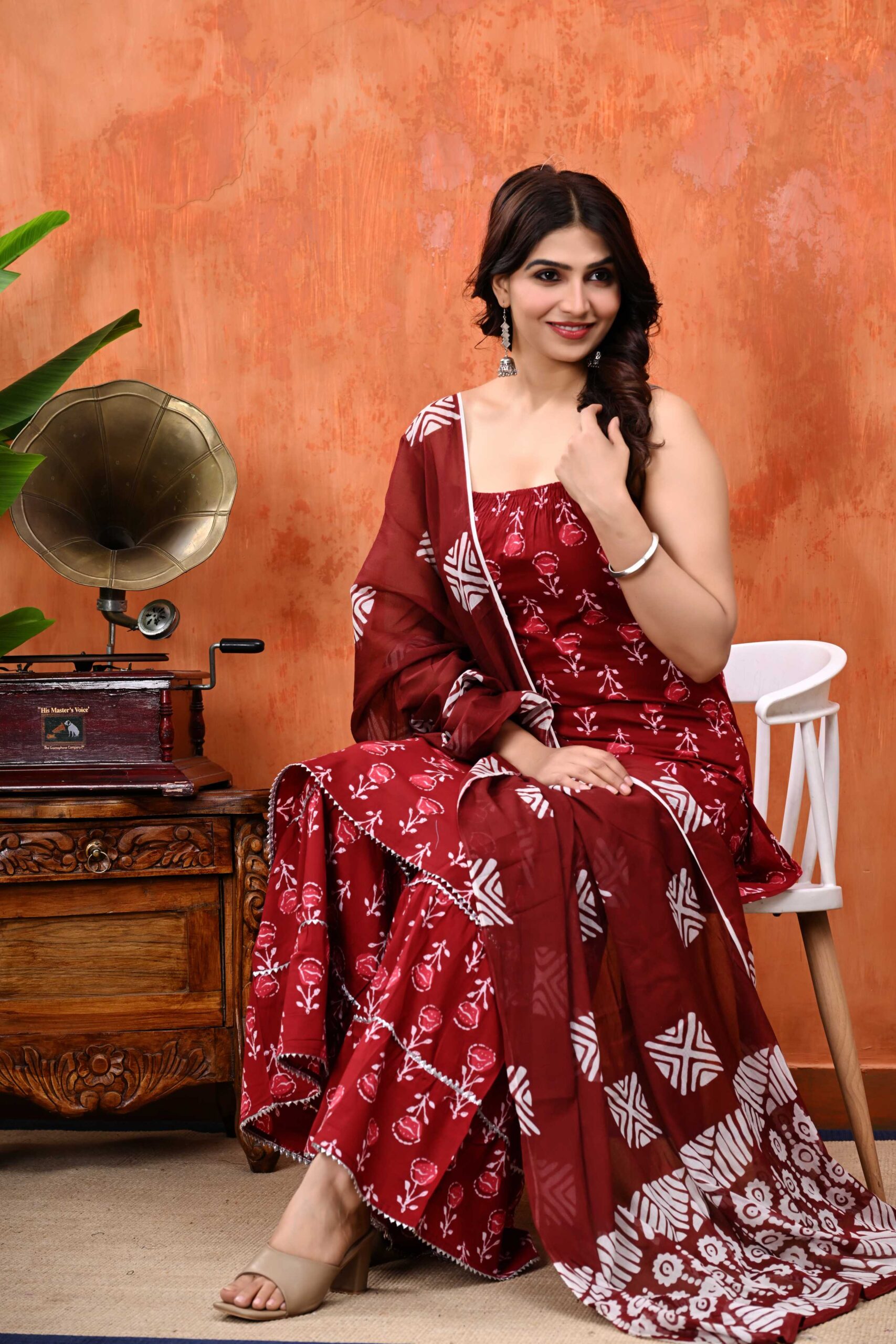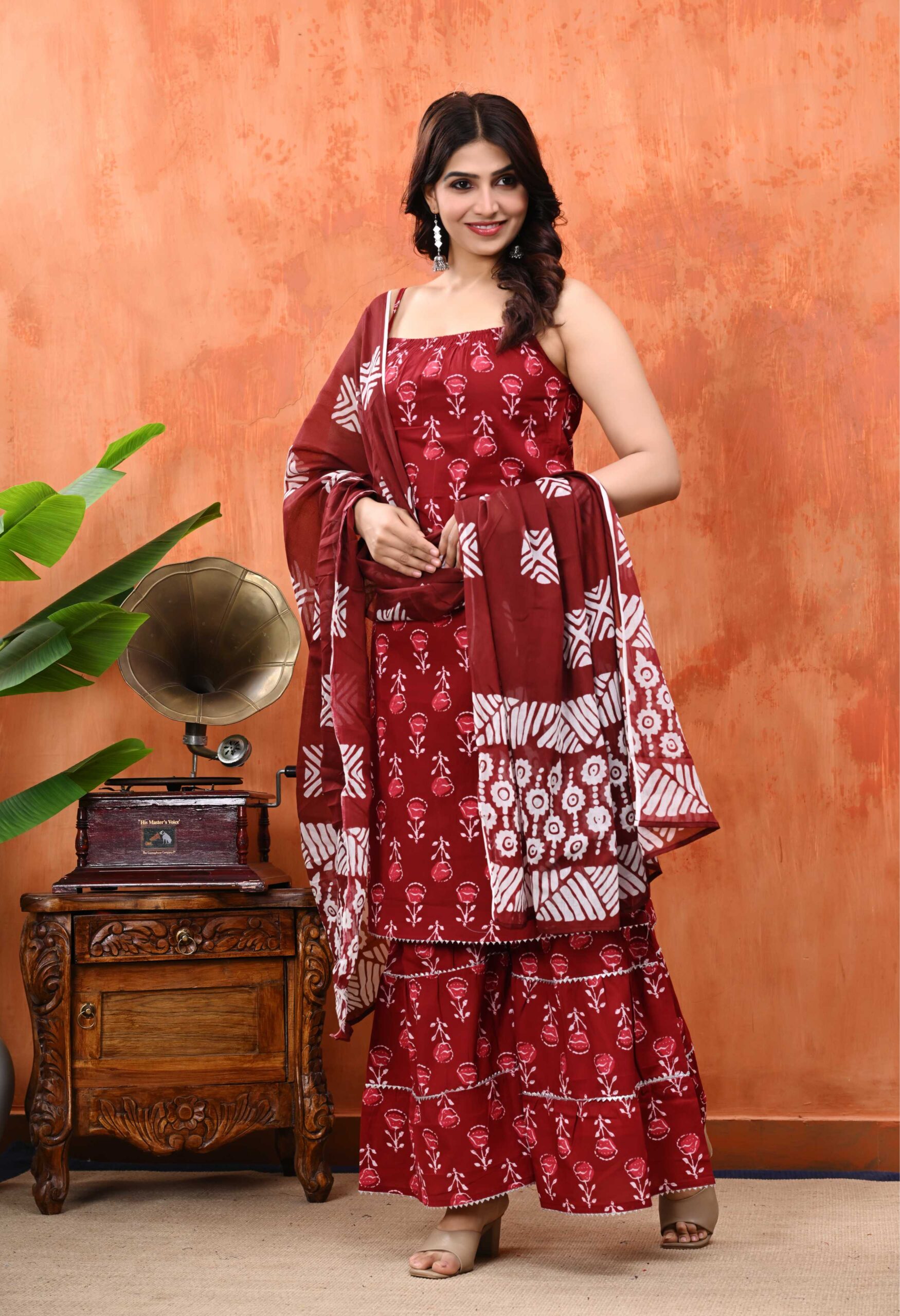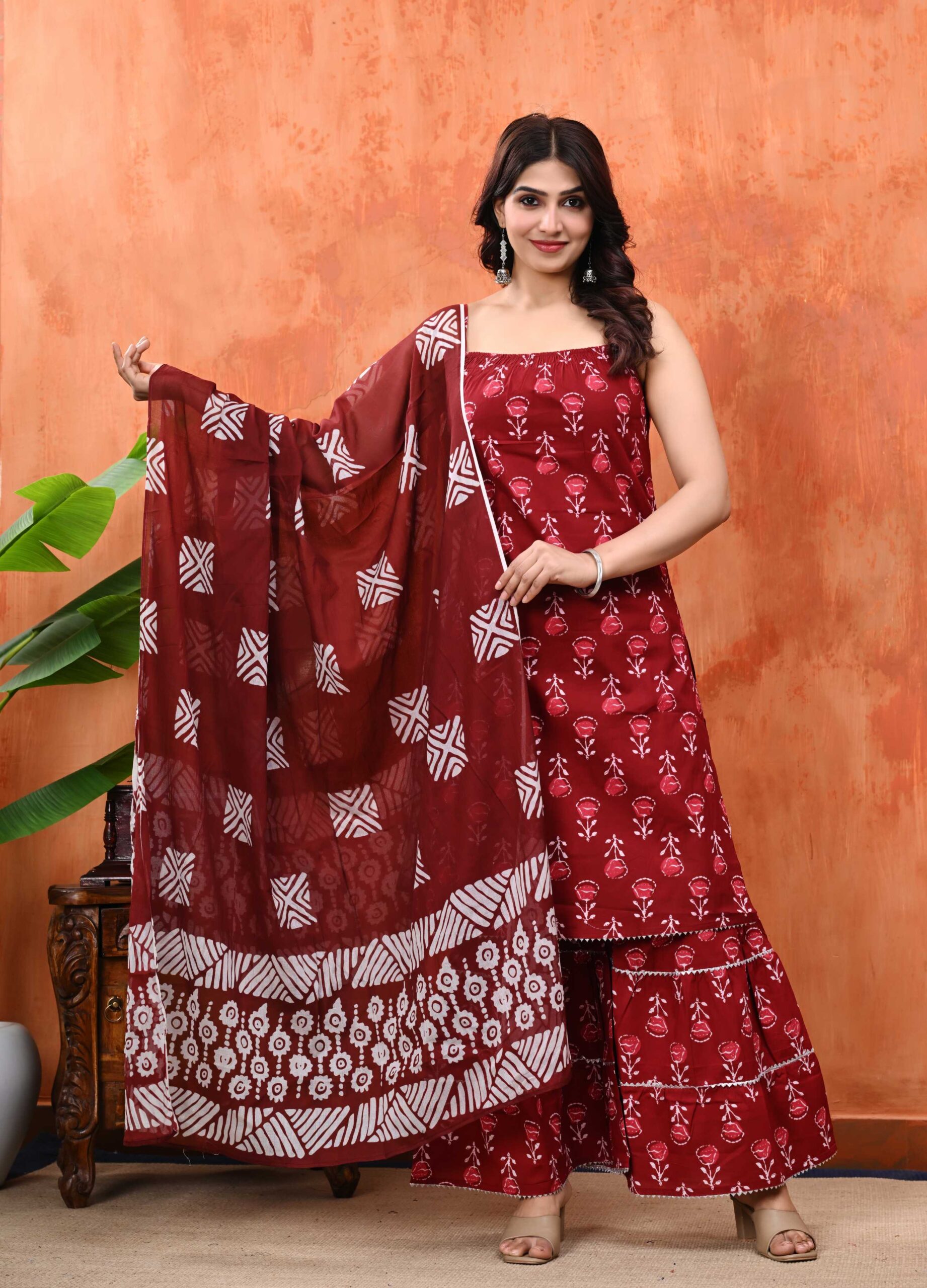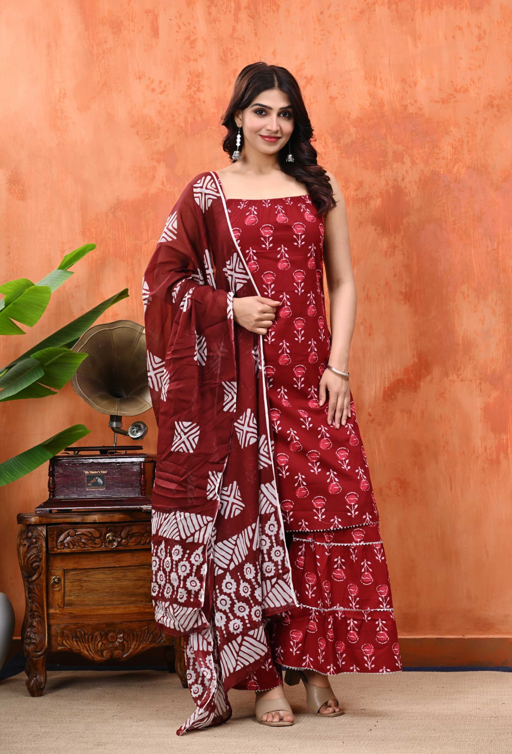 Step into effortless elegance with this beautiful Anarkali kurta set for women, designed to blend traditional charm with modern comfort. Crafted from pure cotton fabric, the set includes a floral printed kurta, matching printed sharara, and a coordinating dupatta — making it a complete ethnic outfit for festive and casual occasions alike.