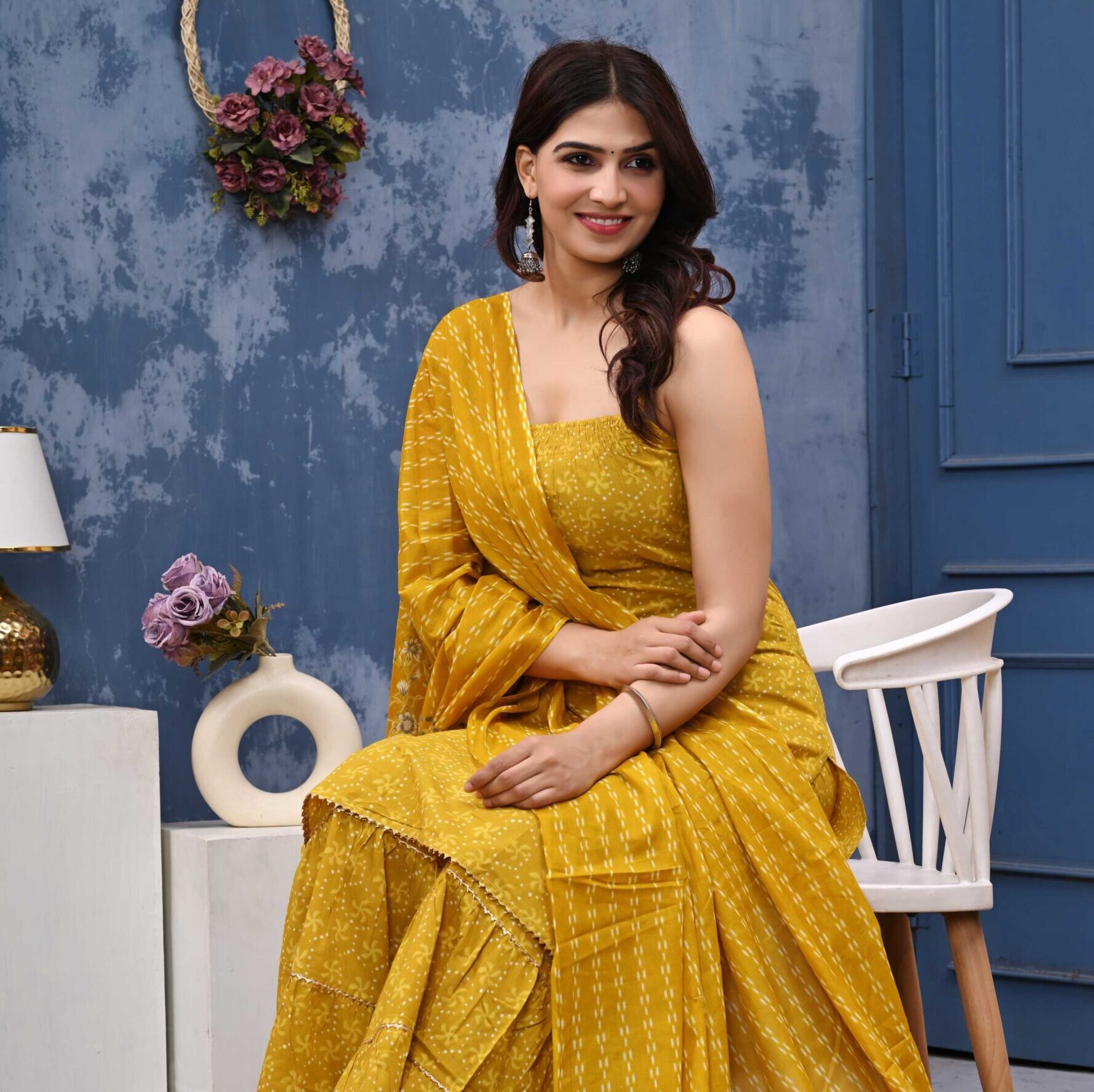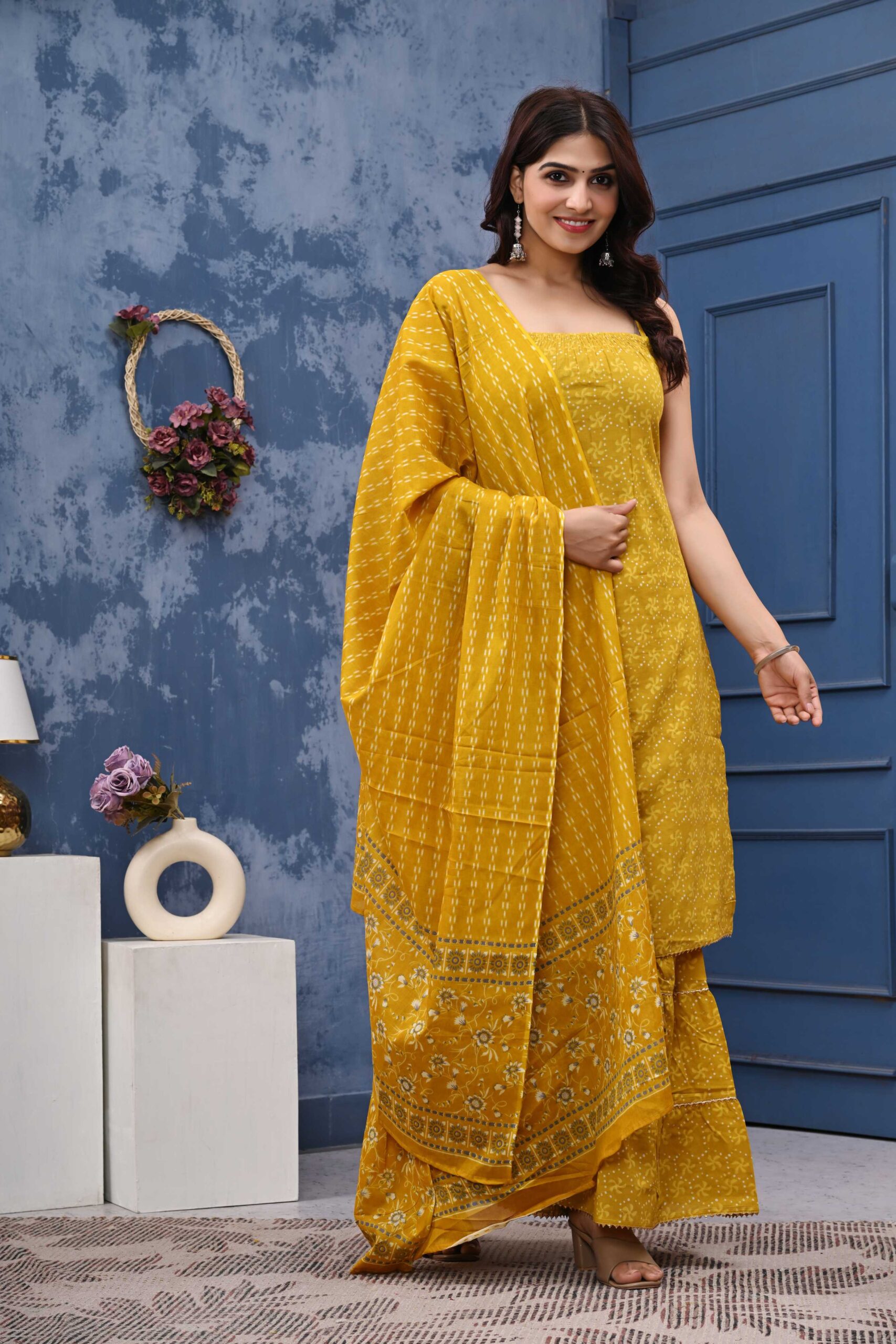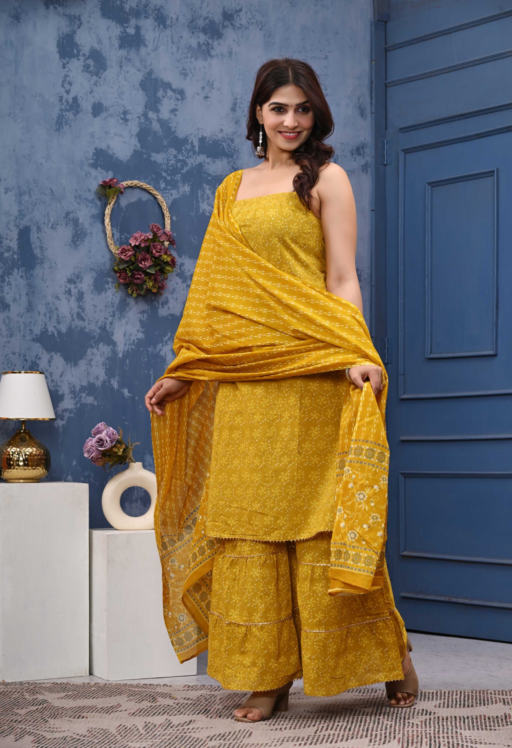 Step into effortless elegance with this beautiful Anarkali kurta set for women, designed to blend traditional charm with modern comfort. Crafted from pure cotton fabric, the set includes a floral printed kurta, matching printed sharara, and a coordinating dupatta — making it a complete ethnic outfit for festive and casual occasions alike.