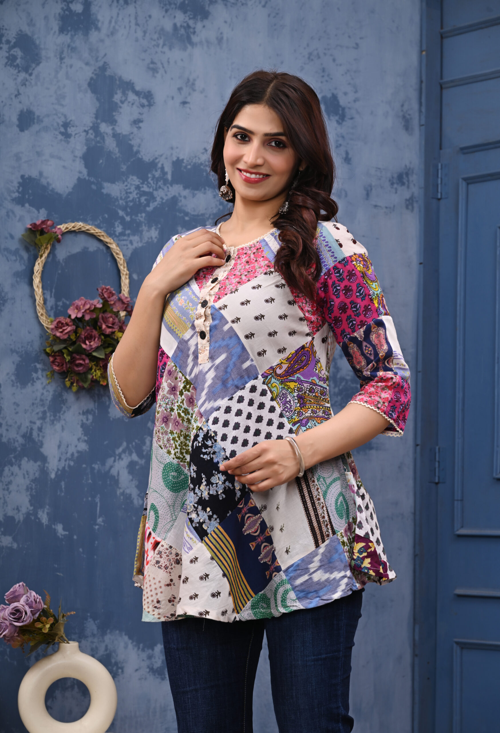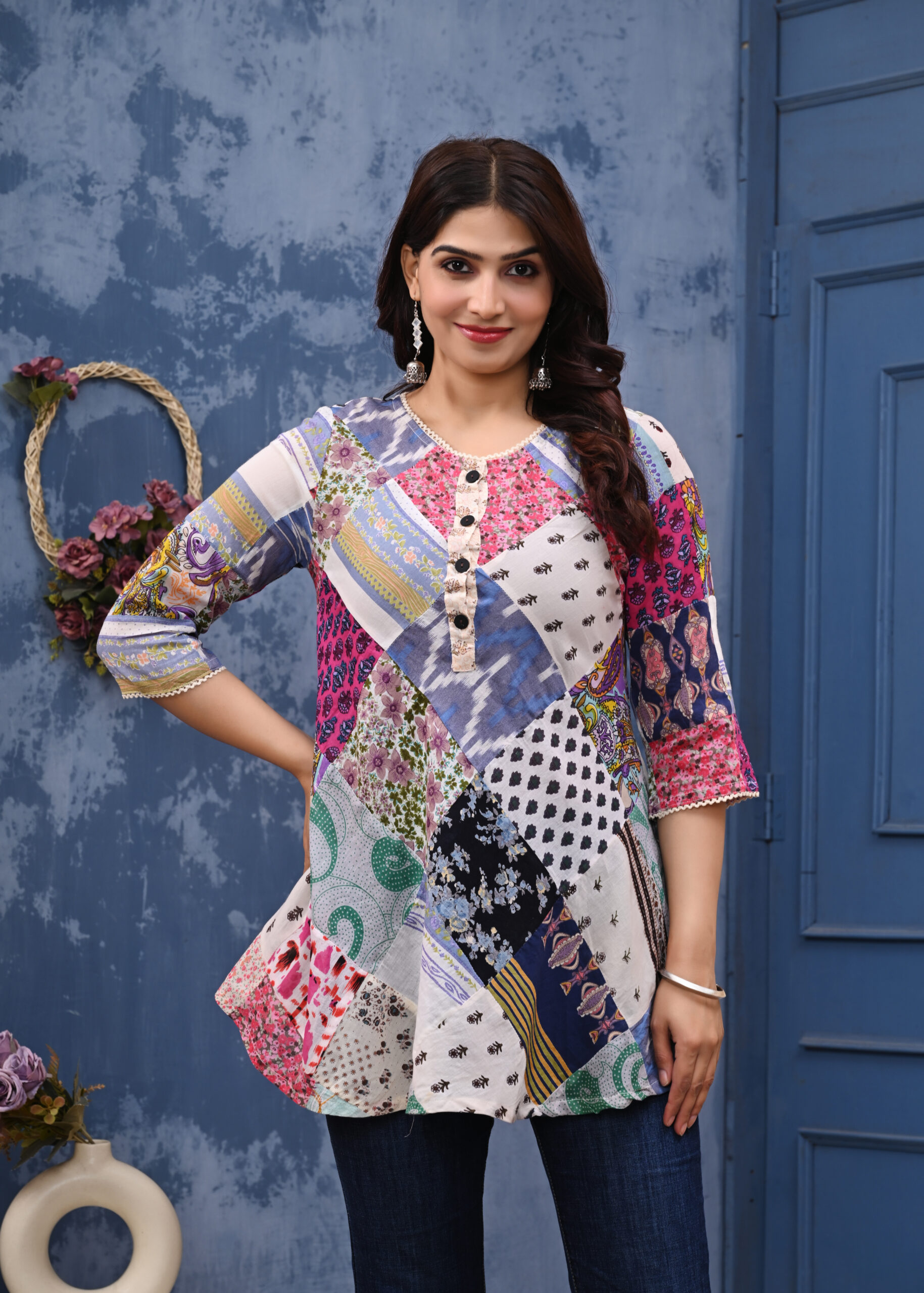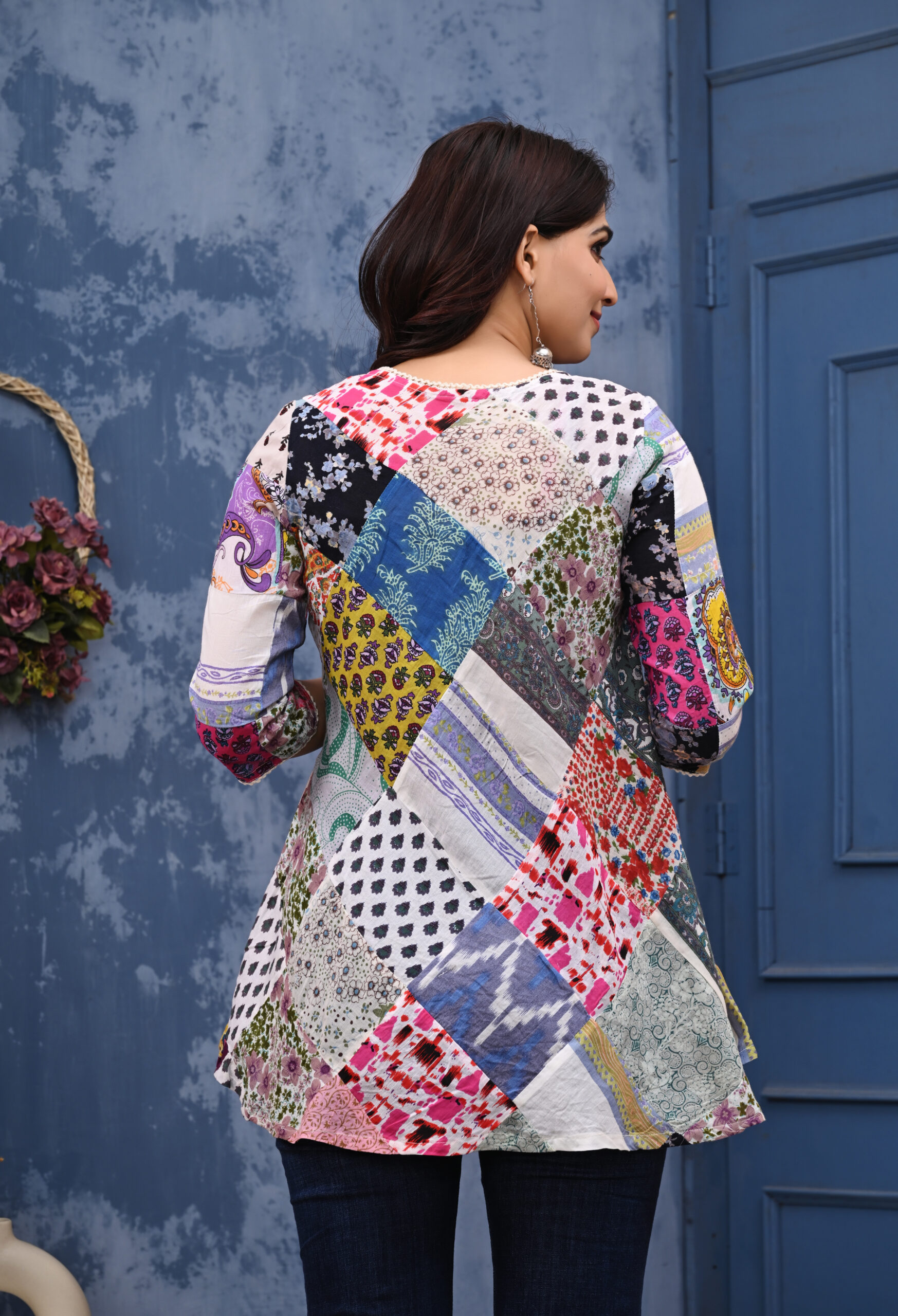 Women Floral Print Patch Work Cotton A-Line Top | Multicolor