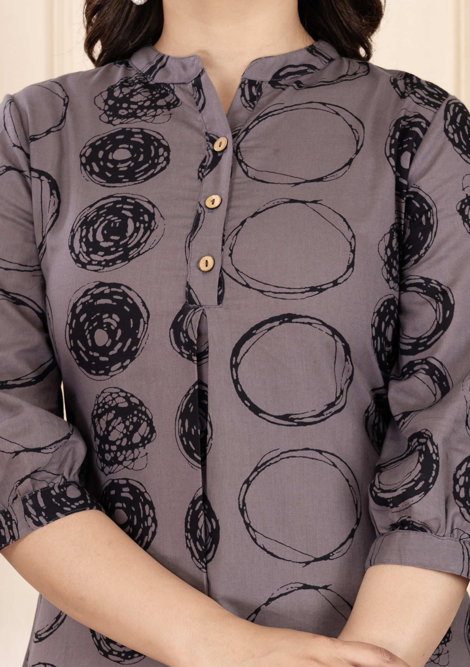 Women Printed Cotton Mandarin Collar Shirt Style Top | Brown