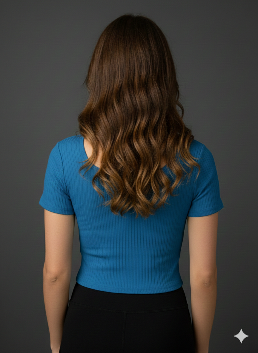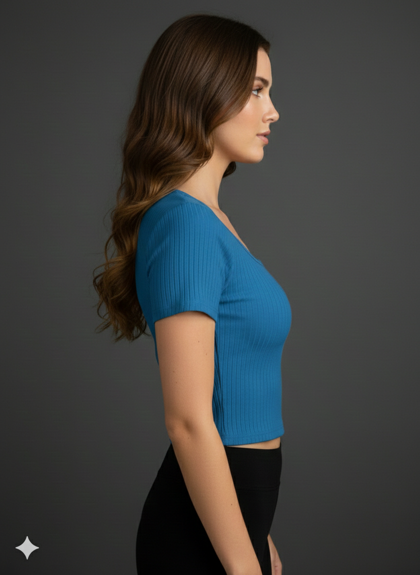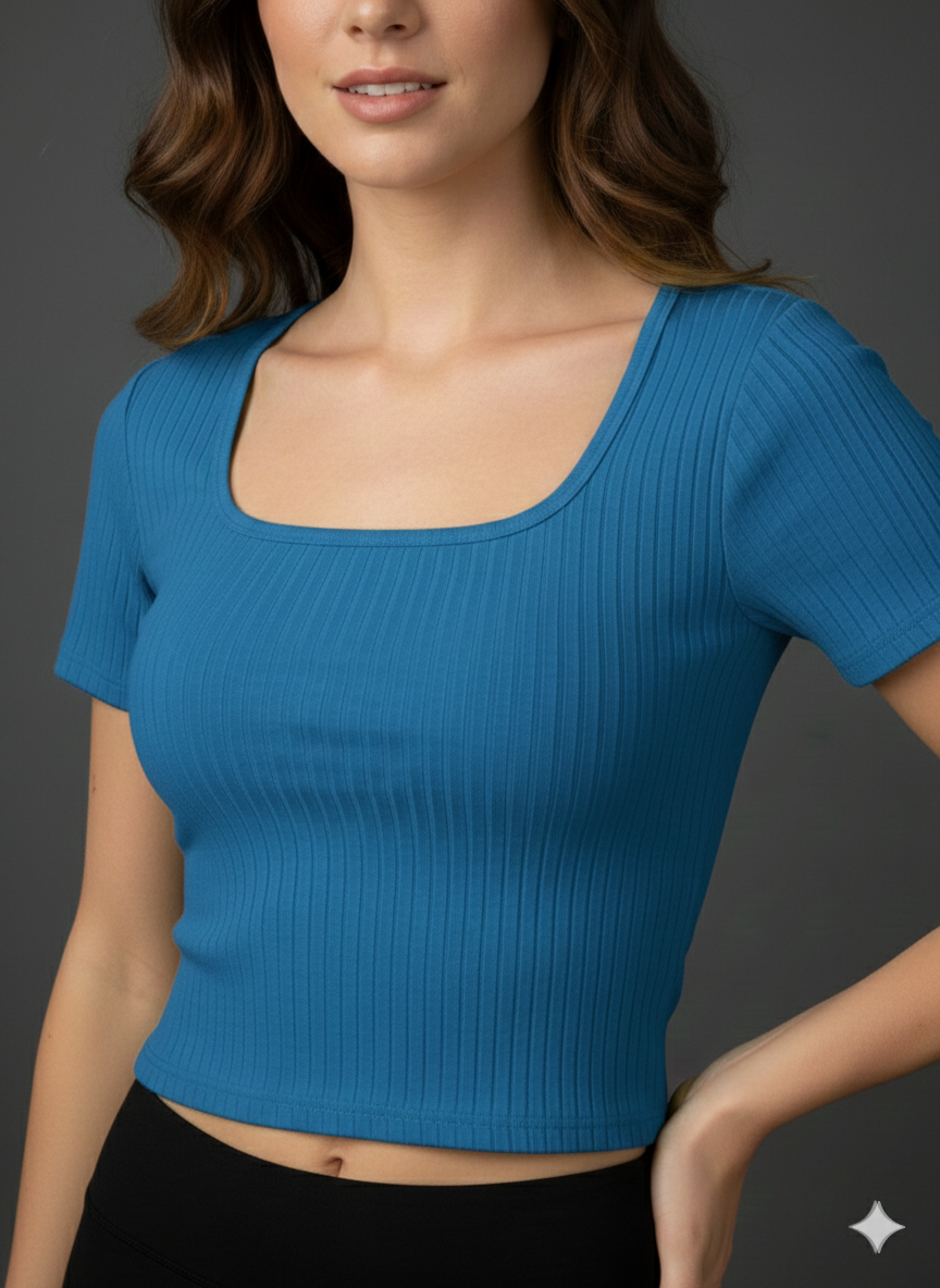 Women’s Cotton Ribbed Scoop Neck Crop Top | Slim Fit Half Sleeve Solid Blue Tee
